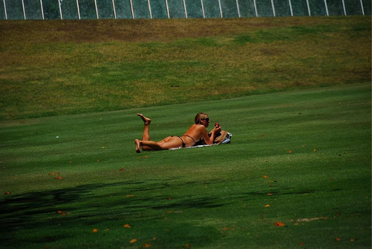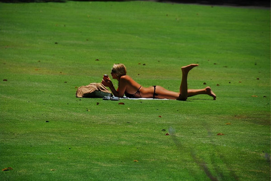 草坪上日光浴的美女