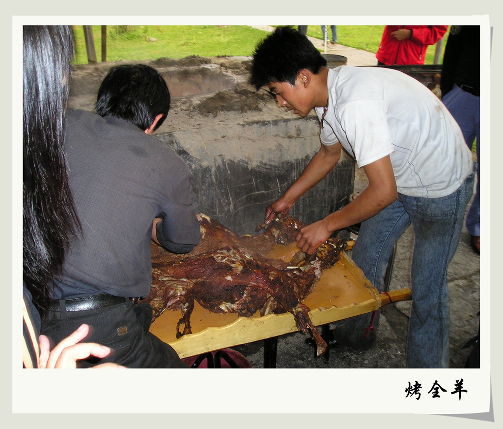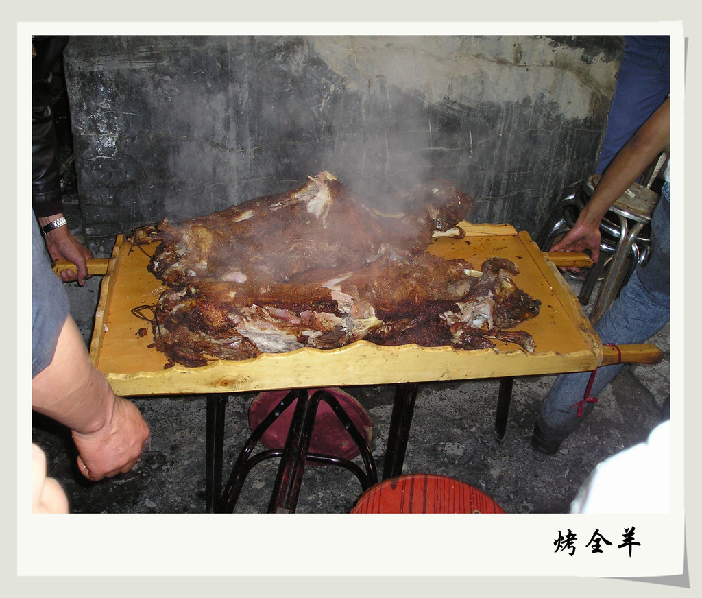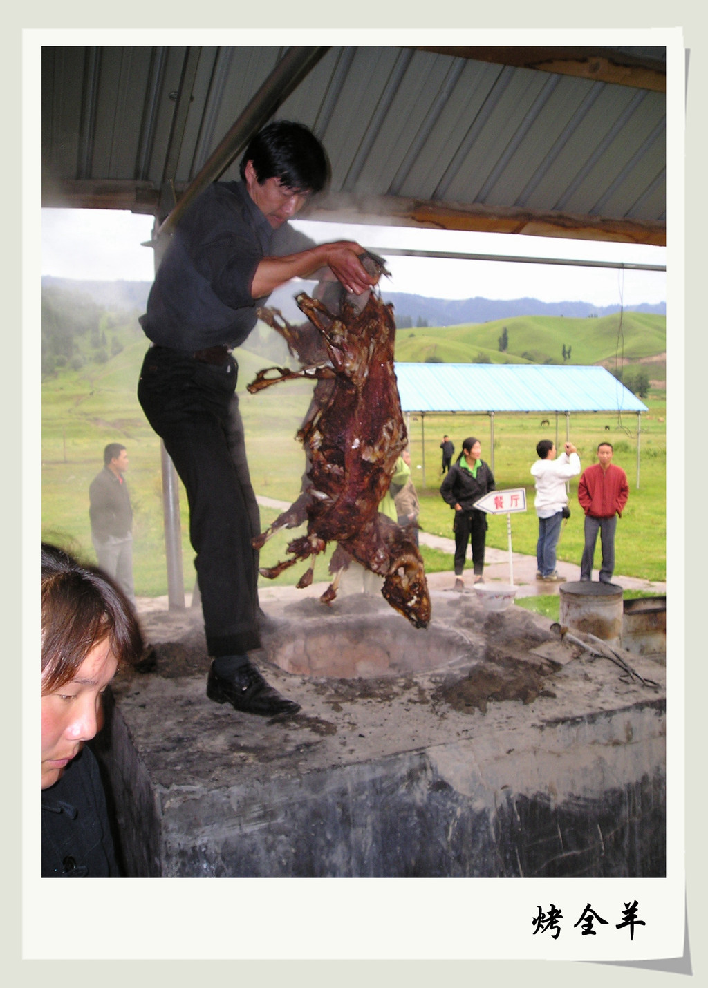 伙房边有一馕坑,正在烤全羊,当伙夫将烤熟全羊从囊里取出时,许多游客拿着照相机和摄像机对着看上去很可怕烤全羊拍摄。二只热气腾腾的烤全羊从馕坑里被提了出来放在一木板上,抬进了在不远处的三个蒙古包中最大的一个,那里有一群人正在联欢。