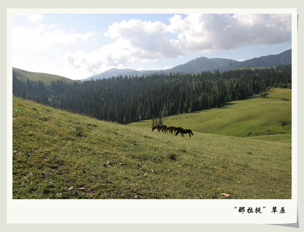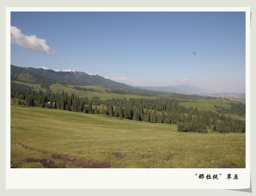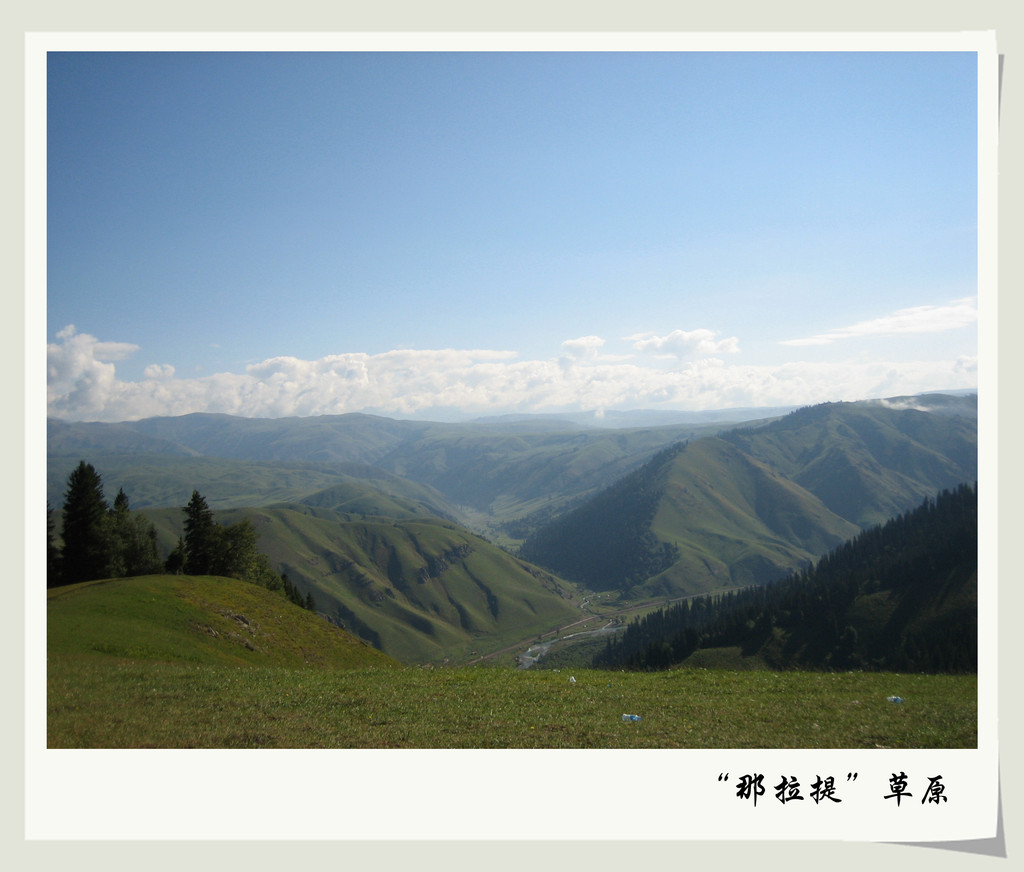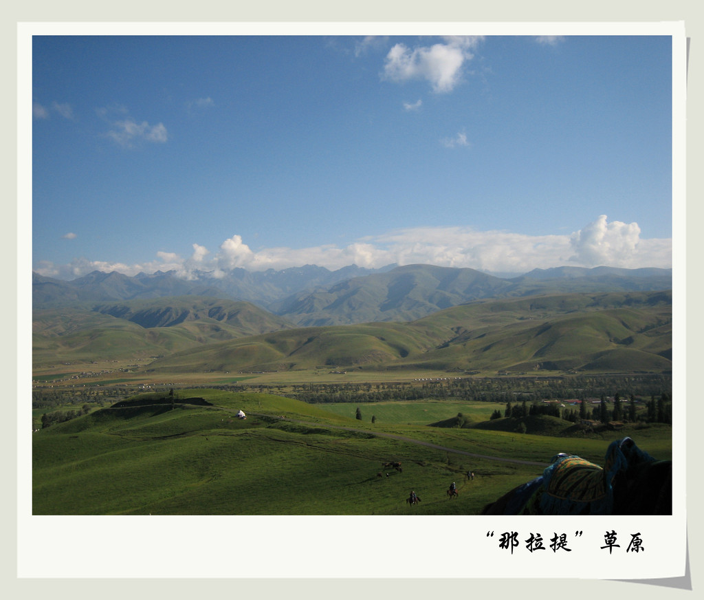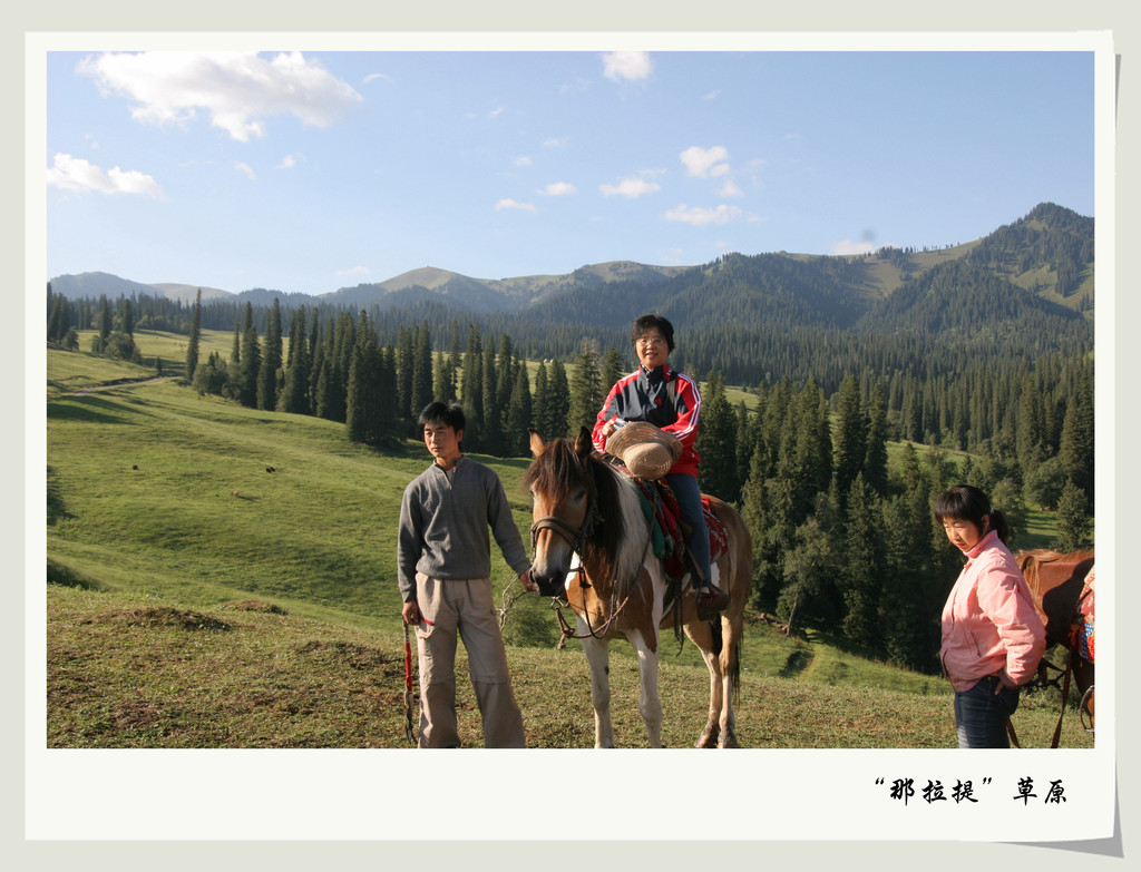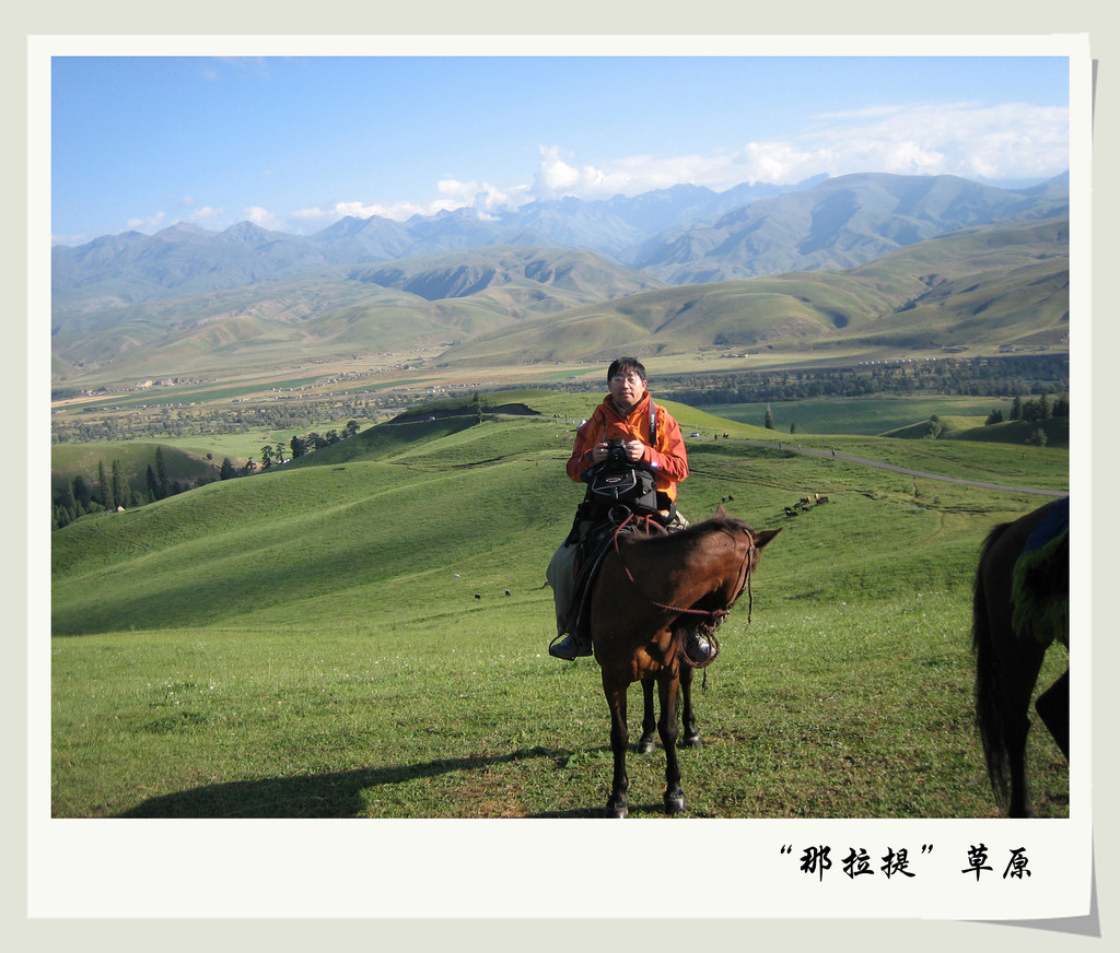 这天的游程是上对面的山上,欣赏“那拉提”山谷草原。11时集合离开景区前往巴音布鲁克大草原。由于女儿的原因,我们都没有心思去领略大自然的美景。太太提出既然来了就应该上山看看,决定由我代表我们全家上山,太太和陪女儿在旅馆休息。很感动!于是带上照相机和DV摄像机,肩负使命,骑上马就上路了。