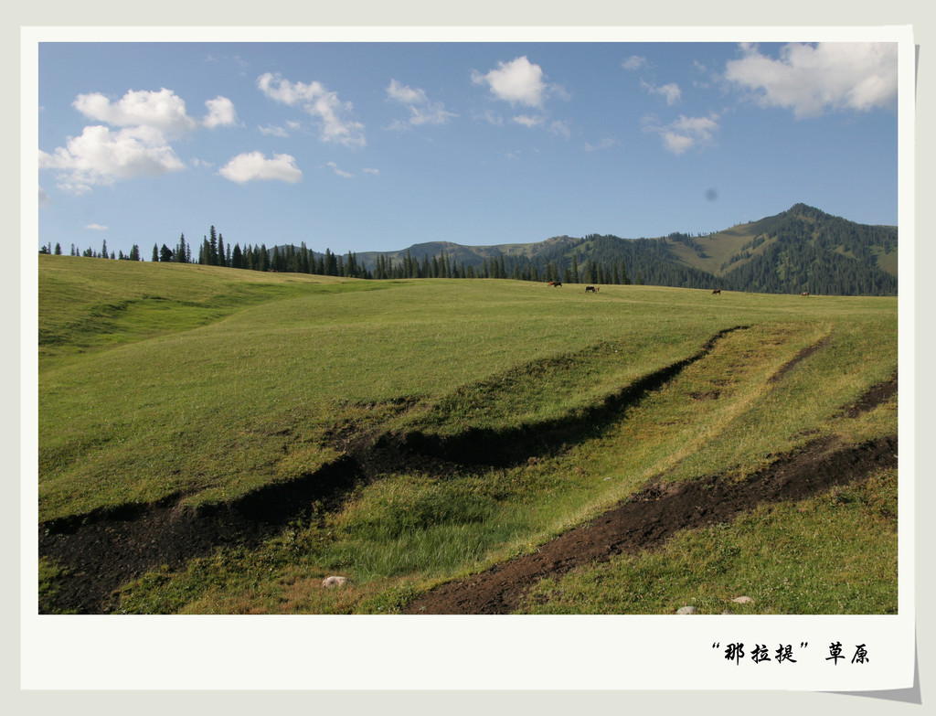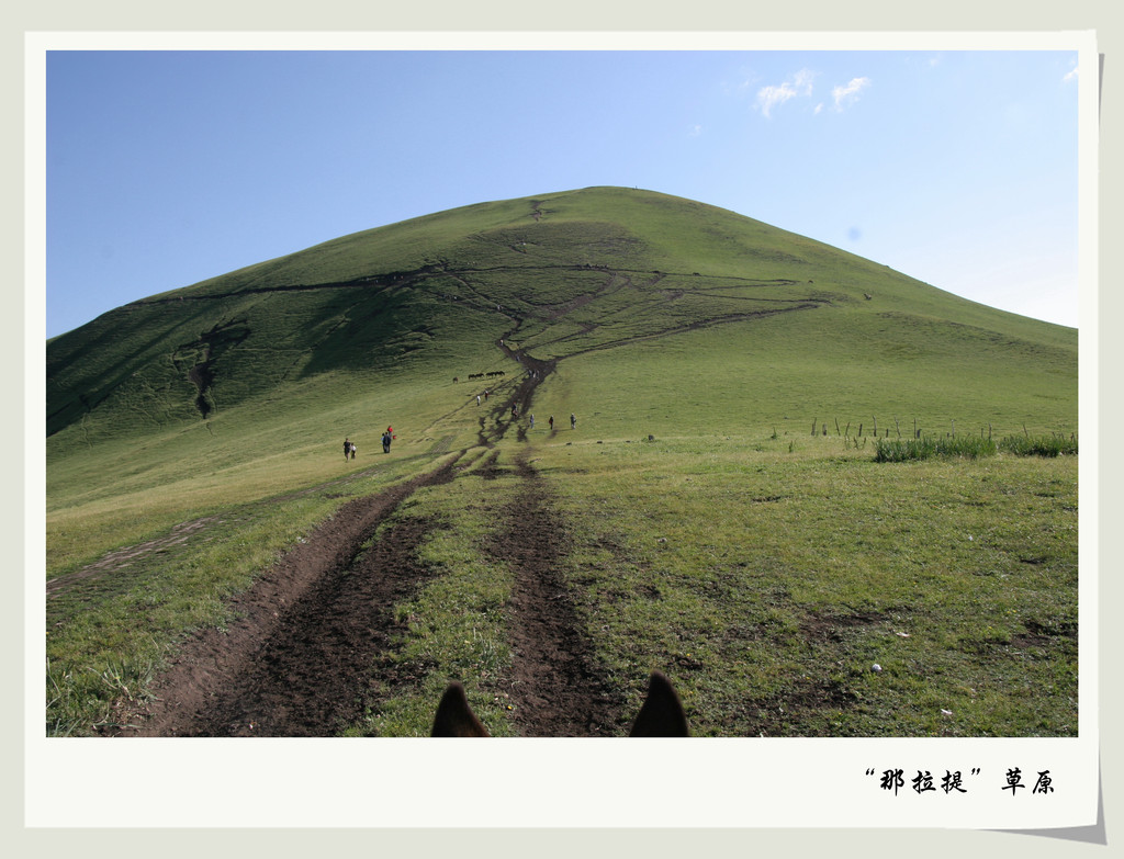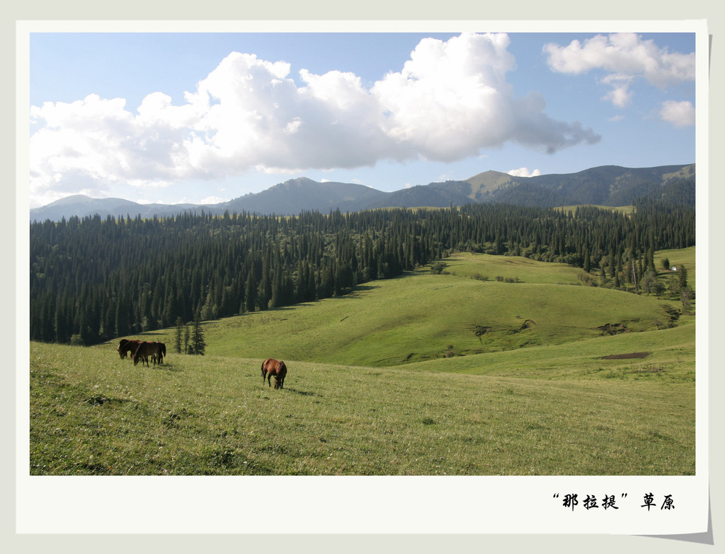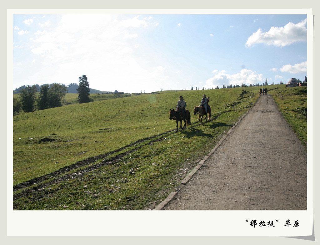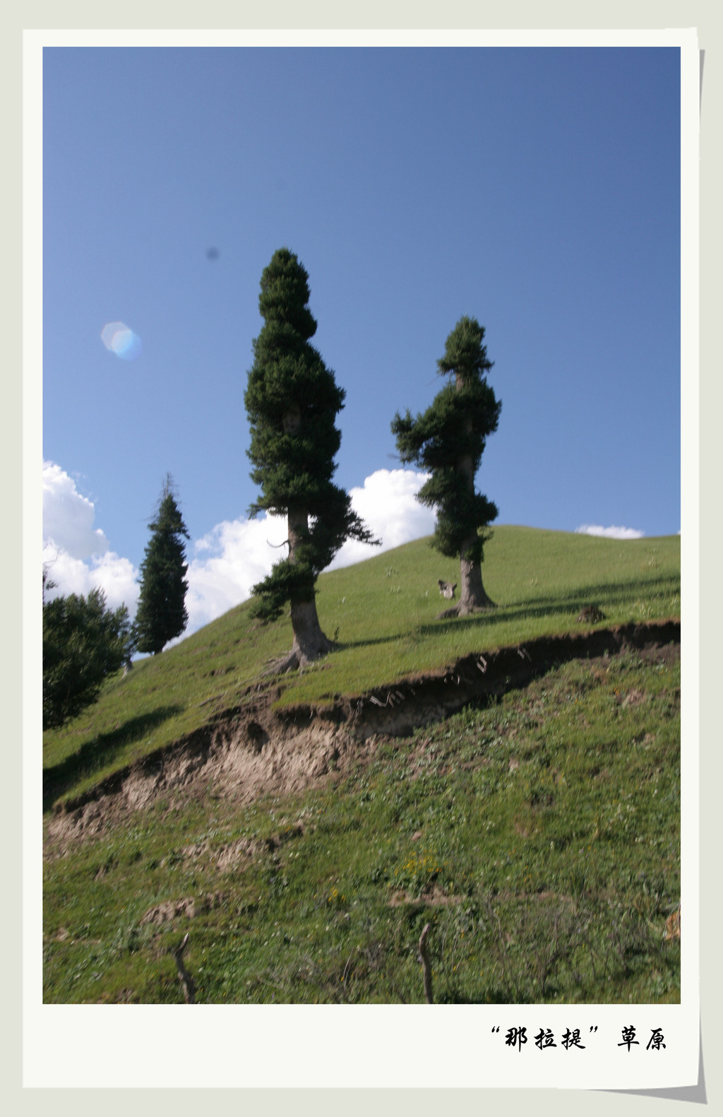这天的游程是上对面的山上,欣赏“那拉提”山谷草原。11时集合离开景区前往巴音布鲁克大草原。由于女儿的原因,我们都没有心思去领略大自然的美景。太太提出既然来了就应该上山看看,决定由我代表我们全家上山,太太和陪女儿在旅馆休息。很感动!于是带上照相机和DV摄像机,肩负使命,骑上马就上路了。