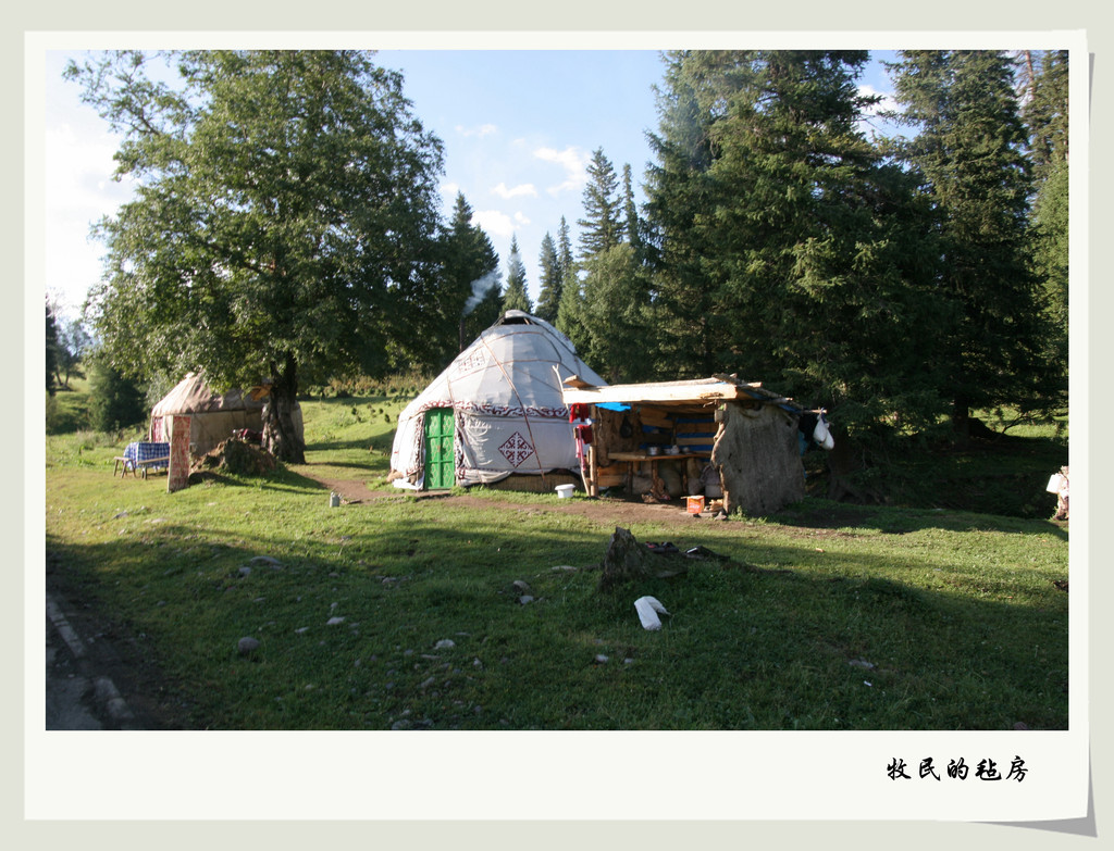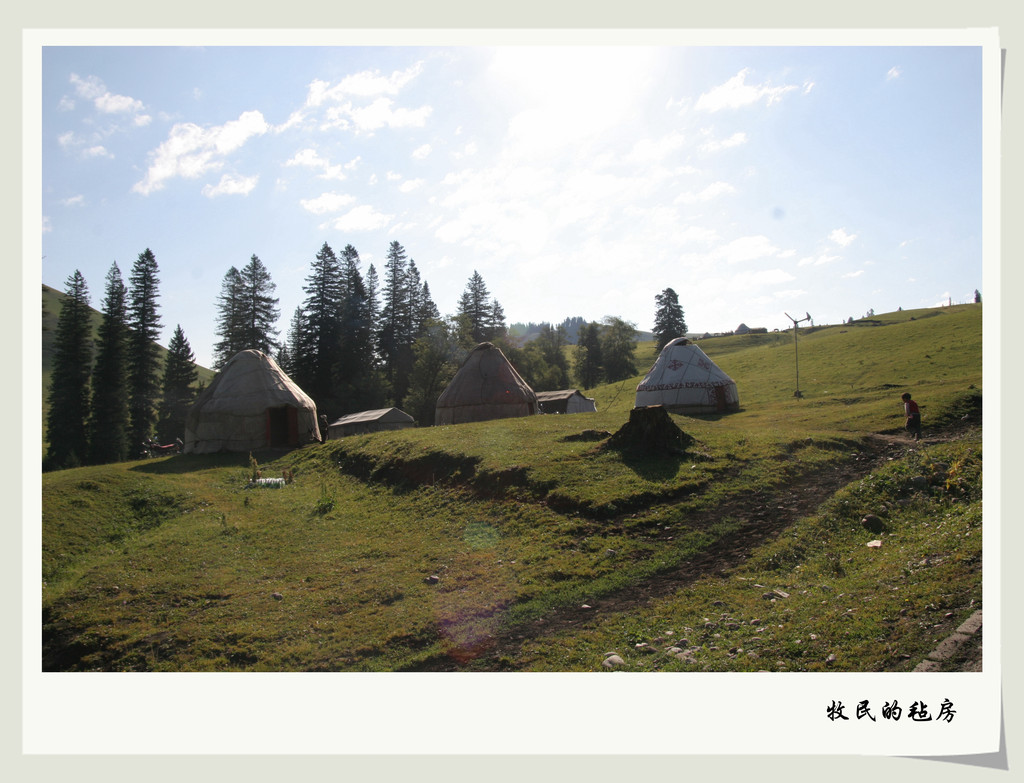 一路上,偶尔看到牧民的家,有的很简陋,有的比较富裕,有风力发电系统。这时正是新疆的早上,牧民们正在刷牙洗漱,从毡房中伸出烟囱的袅袅炊烟,估计正在做早餐。期间我不小心将相机的镜头遮光罩掉在地上,按常理我因下马去捡,但这马很高,我怕下马后上不了马(站在地上脚蹬在我腰部以上,上马时我通过步级踩上的),又怕下马后马走了我控制不住它,于是我勒住缰绳让马停下,但周围没有一人。不一会,我看见不远的毡房里走出一人要刷牙,马上大声地呼叫“喂,喂”,那牧民回头张望了几下就刷他的牙了,可能他认为不是在喊他或是其他原因。我继续地喊,他刷完牙望着我,我就对他说:“帮我捡捡东西”,他木纳地对着我,我又对他说了几遍,他还是不动。这是我忽然想起他会不会听不懂汉语,于是我就招招手,示意让他过来,他走过来了,我很高兴,指指地上的遮光罩,他明白了帮我捡了起来,我赶紧连说谢谢,而他没有反应的回到毡房里去了。我心想他果然听不懂汉语,但是还是很感激他的。可能他会想这城里人懒得连下马捡个东西都不原意。