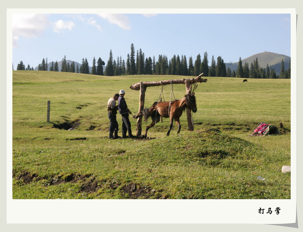 再往前走,不远处有两人将一匹马捆在木桩上,那样子就像电影里敌人拷问革命者。我以为要杀这匹马,后来仔细看了看,两人抬着马脚,估计是在修理马掌。本想走近看看,但想到这么残酷的场景被我的马看到后会不会受惊,到时我控制不了就危险了,因此拍了些照片就匆匆离去。