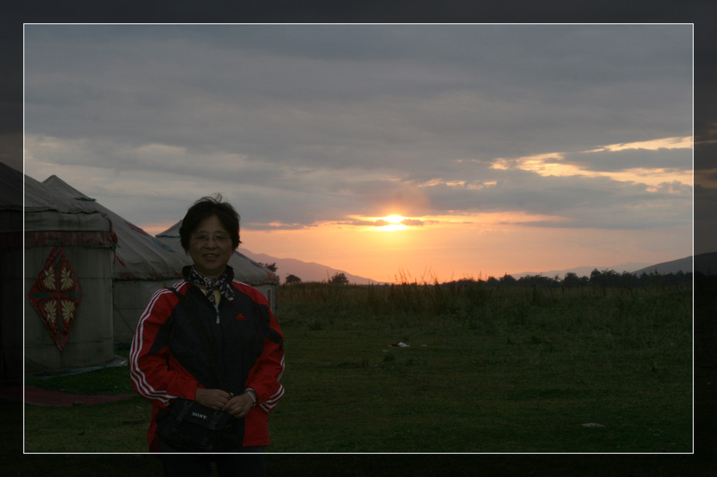 虽然雨已停了,但天气又阴又冷,又加上到了吃晚饭的时间,故安置好行李就去了餐厅。餐厅不大,我们这团人进入后就显得拥挤不堪,我们四人等了片刻才坐了下来。在我们等上菜之时,我去了外面。阴霾的天气使我对草原的印象大打折扣,正当我要回餐厅等饭吃的时候,天空发生了意想不到的变化,这时阴暗的天空突然明亮起来,厚厚的云层在西边的地平线上像被划开了一条口子,日落的太阳露了出来,通红通红的,夕阳撒满了整个草地,眏红了山坡、树干、建筑物。游客们从房间、餐厅里涌出观看日落,同时照相机“卡嚓”不停。这突如其来的日落真是太美了,我毫不犹豫地冲进房间拿起三脚架,架好相机后各种角度扫了一遍,因为时间太短了,太阳迅速地消失在地平线下,天空更加黑暗了。