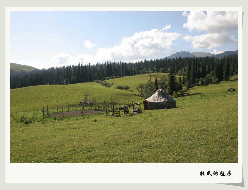 到达那拉提草原时,天很阴,下着小雨,气温也很低并且风很大,感觉像冬天。我们换乘景区的专用车向宿营地开去,路的右边山峦叠起,森林茂密;路的左边平坦如砥,俨然是个大草场,沿途看到草被收割后压成团,作过冬的准备。