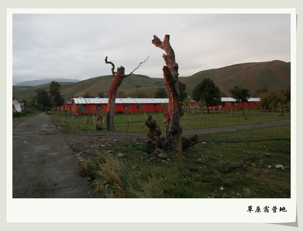 20分钟后到达草原的宿营地。一排排砖瓦平房便是我们的旅馆,所谓标间就是两张单人床,一张桌子和一个简易卫生间。房顶上的太阳能热水器只是摆饰了,因为放出来的水还是冰冷刺骨的。热水供应靠伙房烧,热水瓶提。