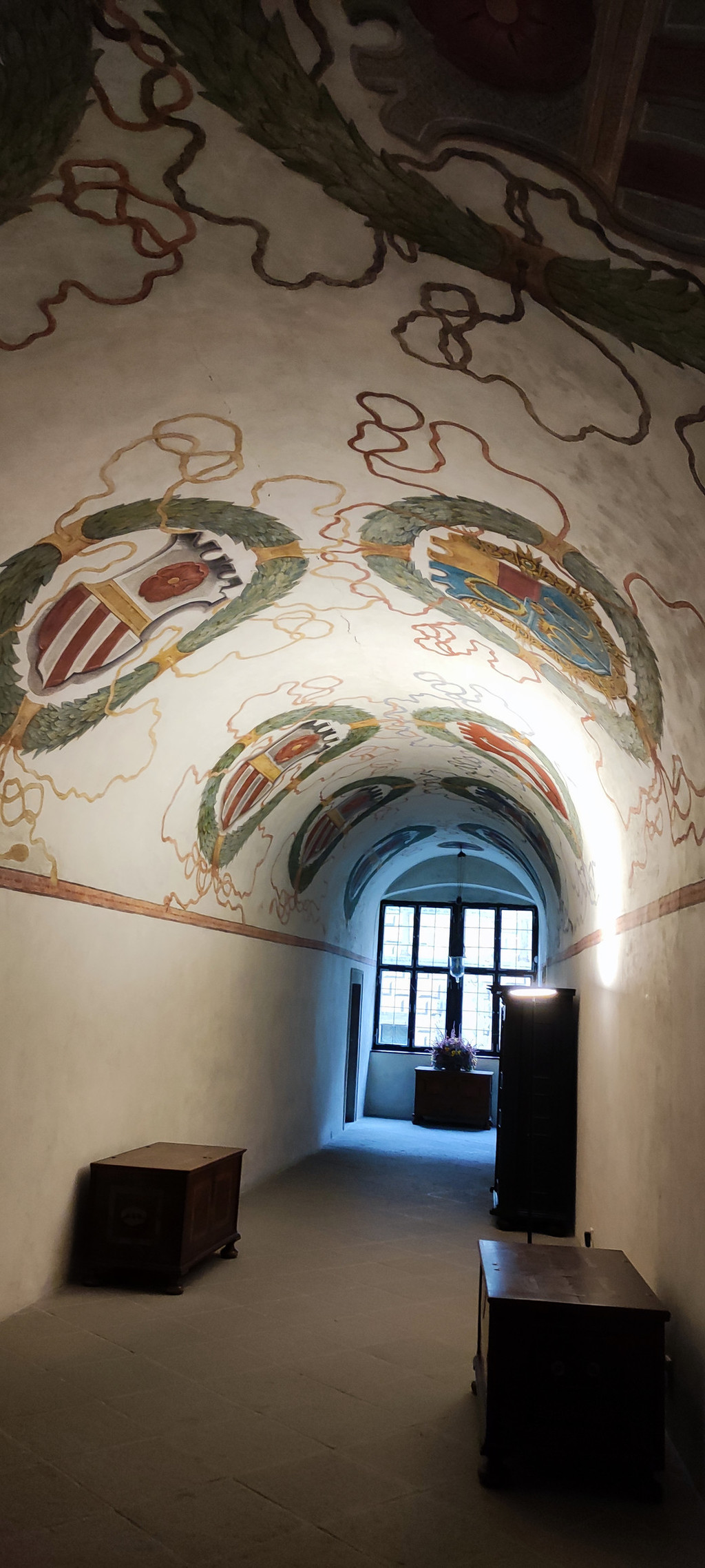 我们登上城堡上彩绘塔顶端,俯视整个小镇的全貌,置身于一片红屋顶之上。