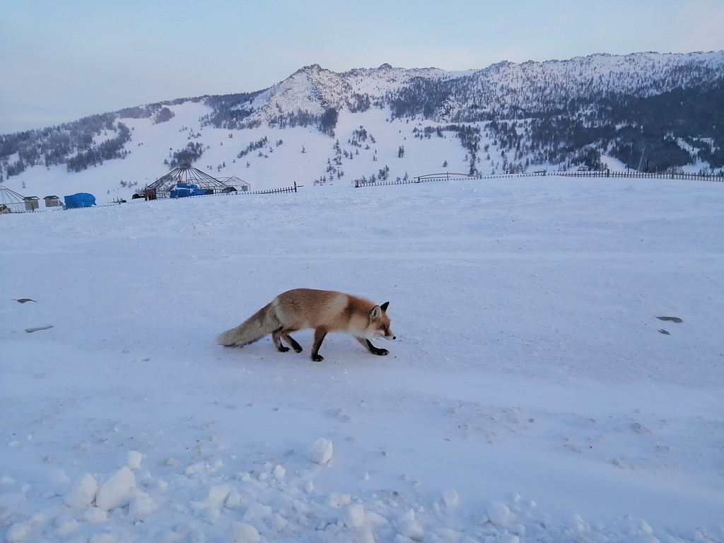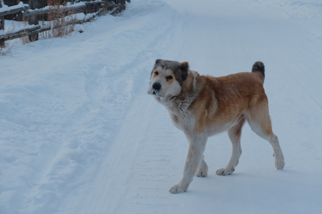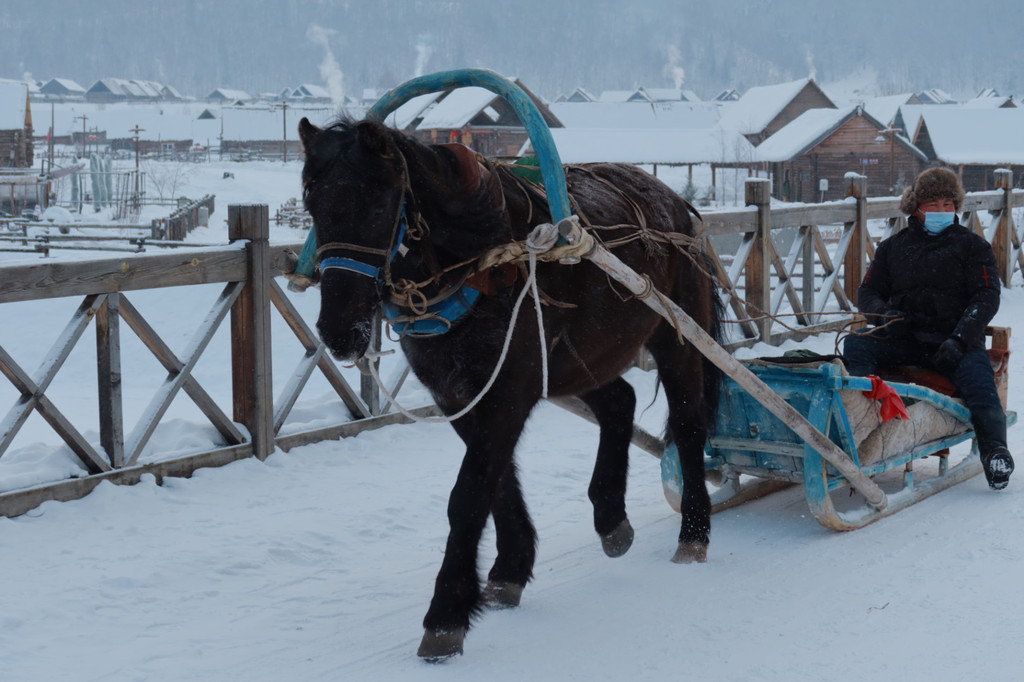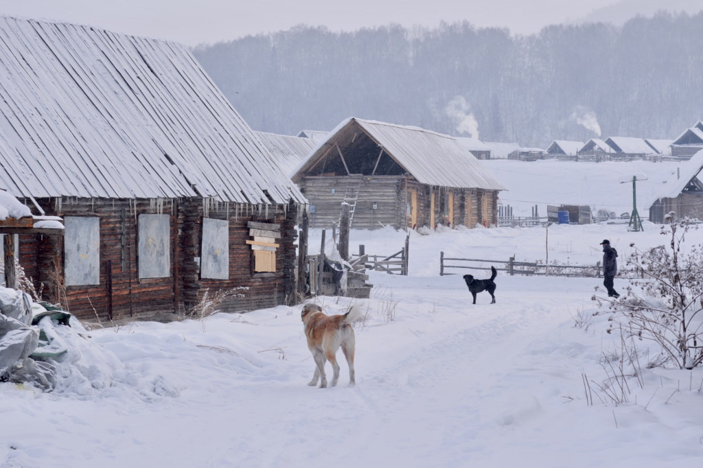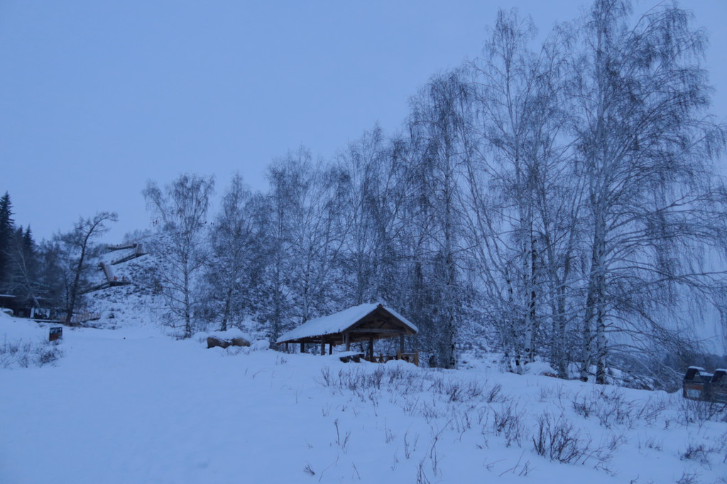 后面深一脚浅一脚的走去观景台,整个天空是暗青色,小狗兴冲冲的在前方带路。过了禾木桥,几个男子手窝在袖筒里围站着,见我们走去说160块钱一个人,我以为是要收门票,心想没有听说有收费啊,不吭声往前走几步,他们松口说100块钱一个人,我才知道是收费坐马拉犁送你上去的。一向自认为体格好的我断然拒绝。