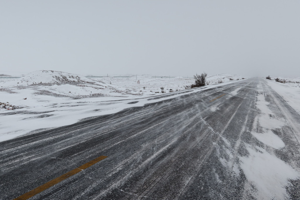 雪被风吹着飘过公路,沙沙作响。像是不会散开且有方向的烟雾,但是比烟雾更厚重,又像是白色的细沙,紧紧贴着路面被风吹着走。