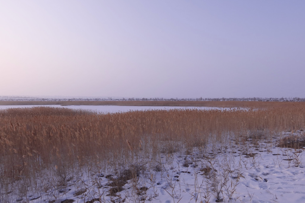 跟着导航车子越开越偏,恰时又快落日了,于是劝说小伙伴不要再找了,周围看起来方圆十里都是一样的。忽然就发现前方有一大片芦苇荡,往里走去是一片湖面,不过跟天池一样已经结冰,白雪覆盖在上面。湖面干干净净没有一处脚印,想必是没有人来过的。