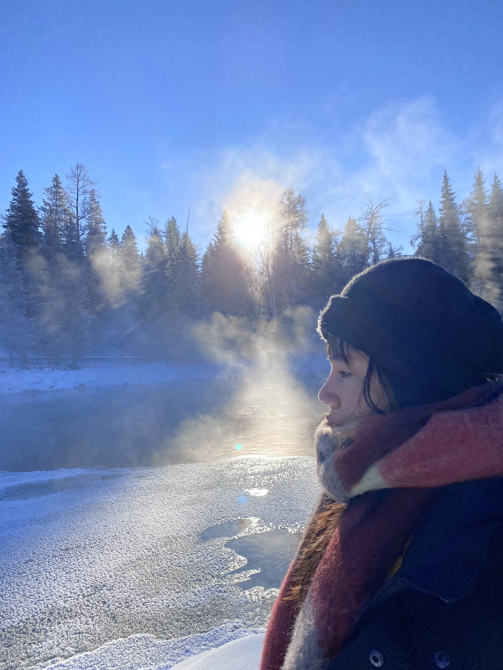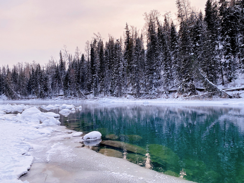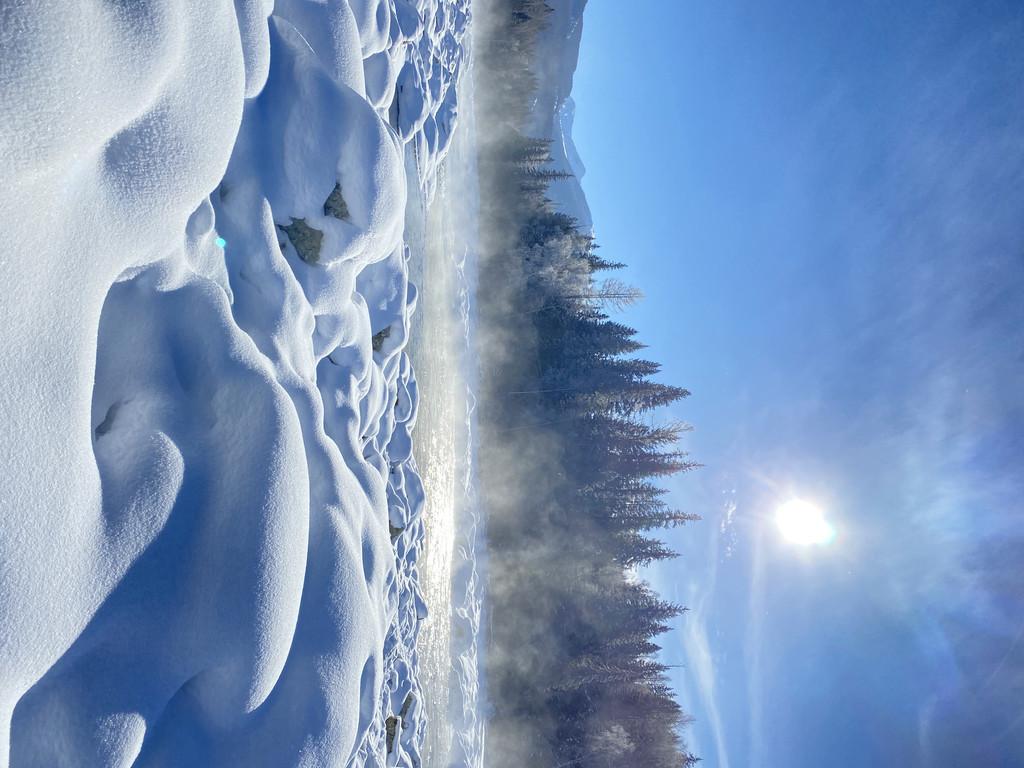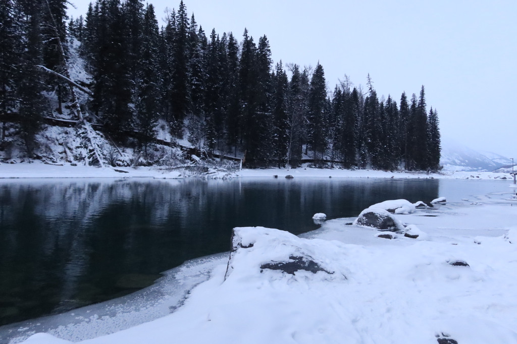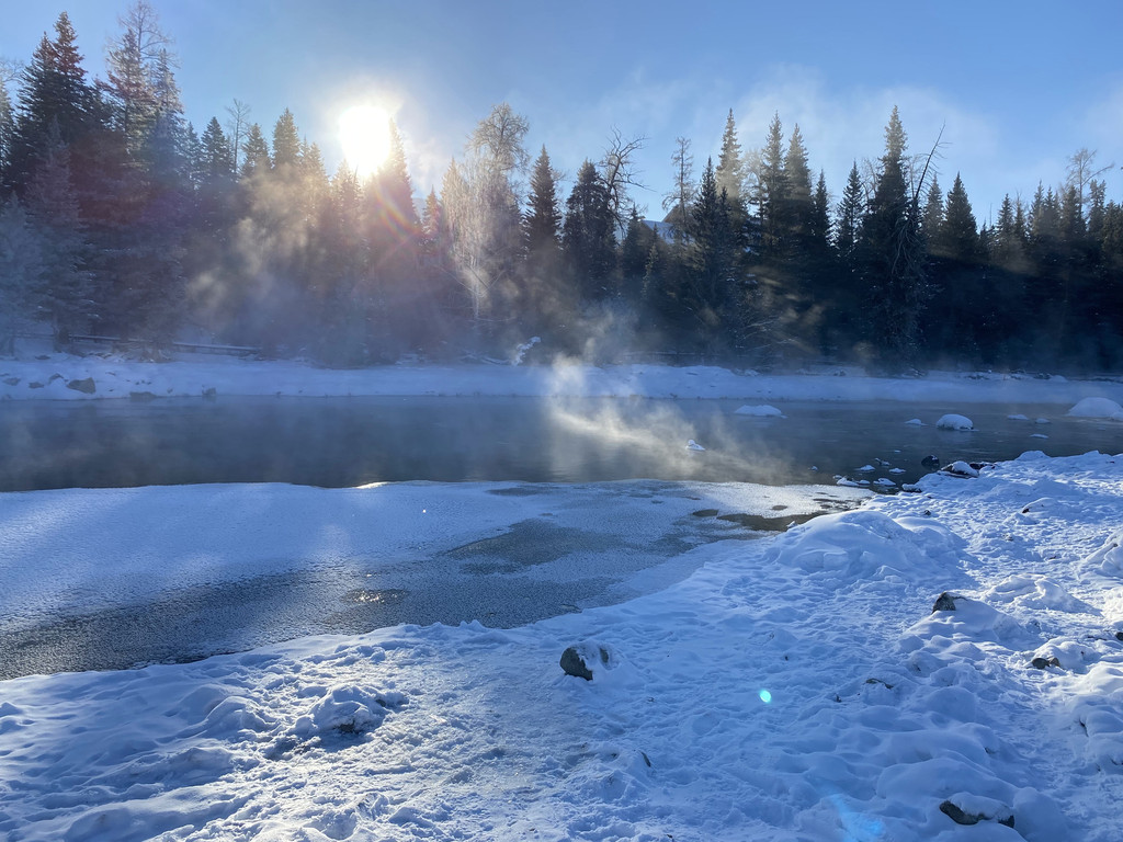 喀纳斯有三个“湾”,分别是神仙湾,卧龙湾,月亮湾。这三个景点是挨在一起的可以一起游览。早晨看晨雾的话,首选还是神仙湾。喀纳斯湖尚未完全冰冻,湖水潺潺,白雪掩映,白桦森林在雪中郁郁葱葱,晨雾在阳光下缓缓上升。