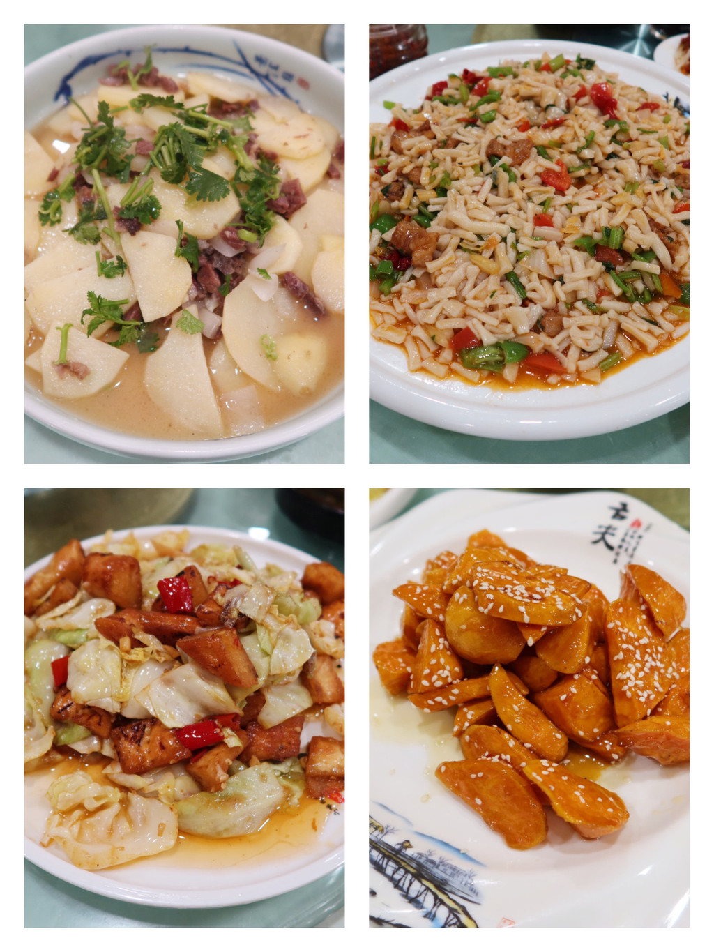 第一餐肯定是要试试新疆大盘鸡的,另外点了拔丝红薯、哈萨克土豆等。值得一提的是,新疆的奶茶是咸咸的,奶香味和茶味儿都不重,入口的味道我们一行人都不太能喝的惯。