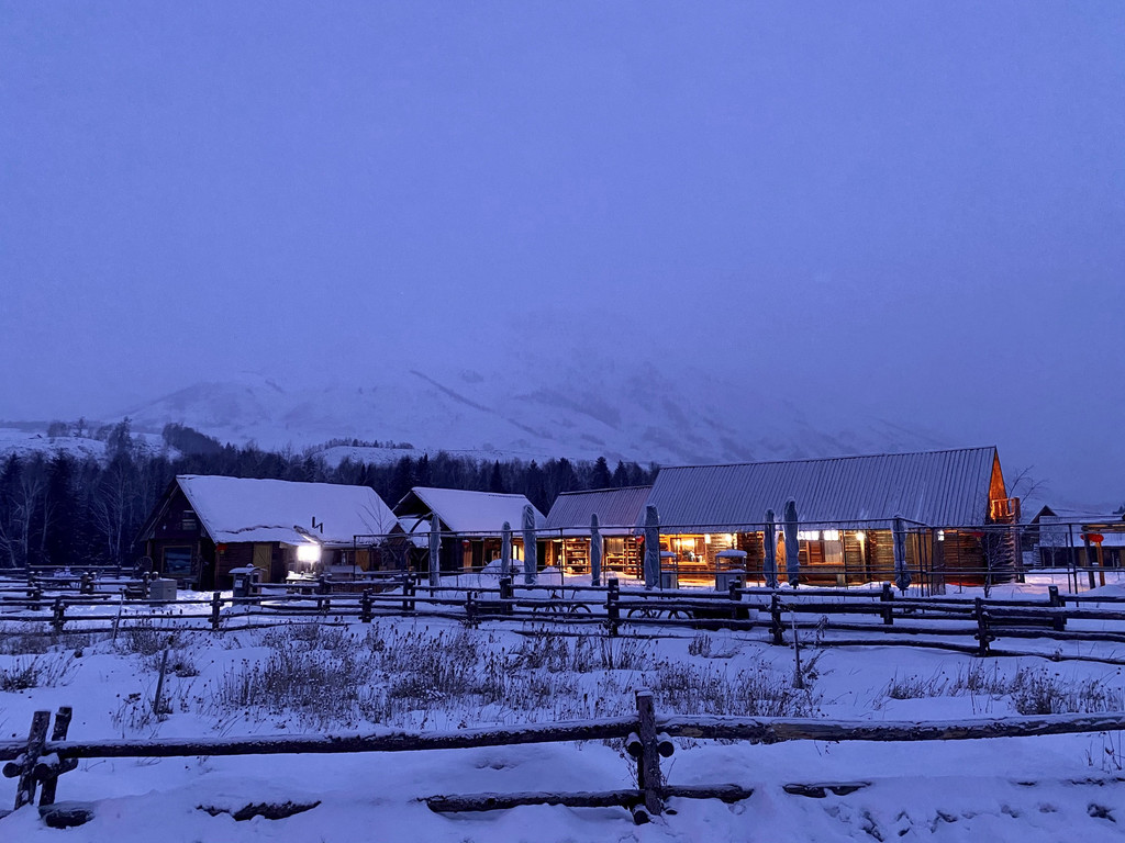 禾木村整个村庄都是小木屋建筑,每家小木屋要么是民宿,要么是超市或者餐厅了。即便如此因为淡季无人,冷冷清清,也不觉得有什么商业化。晚上整个村子都很安静,夜色里的禾木像是被按了暂停键,一眼眼望去都是静止的场面,偶然又见一缕炊烟,或者溜过去的猫狗,你才会想着不是行走在虚幻世界里。