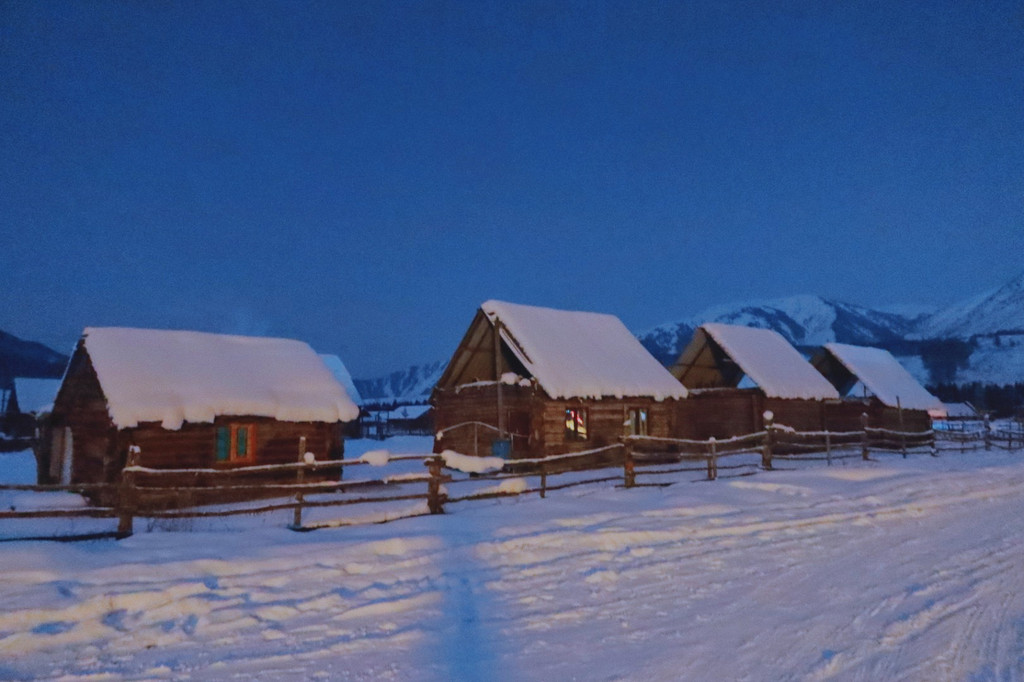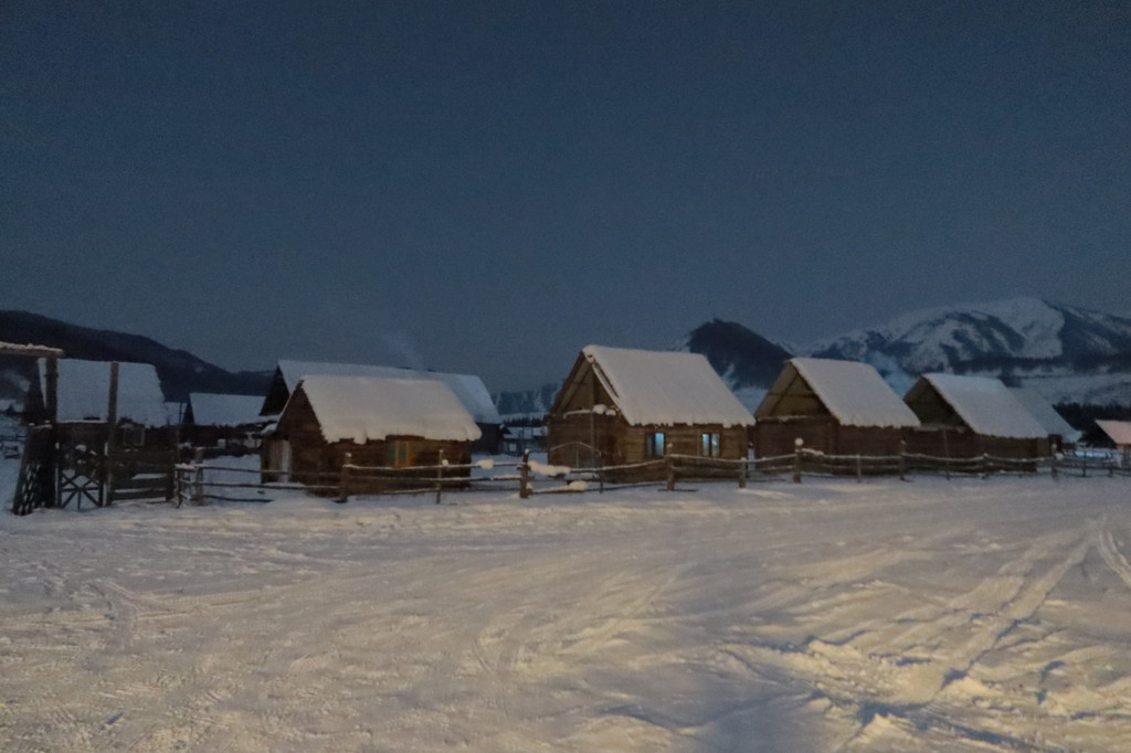 来到禾木天色已经完全黑了。我想如果在傍晚来的话,各家民宿暖黄色的灯开着,可能看起来就像是哈尔滨的雪乡吧。
