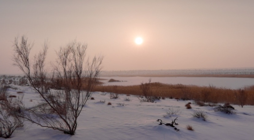 现在都无法形容当时见到它的欣喜以及震撼。夕阳西下,芦苇随风摇摇荡荡,踩在雪里深一脚浅一脚朝芦苇从中走去,看着它在夕阳下摇曳。月牙湾湖面结冰,白雪皑皑一片无人踏足,整个场面显得显的温柔又凄寒。我想它是不需要人欣赏的,就静静的在这僻静之处迎朝送夕,默默的孤独的美丽着。