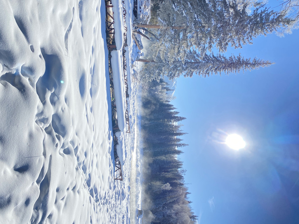 第二天一大早起来,准备去看日出。从民宿走到看日出的哈登观景平台大约需要半小时。八点半准备出发时,民宿大叔迷瞪着双眼问我们干嘛去,我们兴高采烈的说准备看日出去。大叔说日出时间是十点,你们现在就过去吗?当天早晨温度大概是零下三十度。此时回被窝也睡不着了,出发在那边等着估计会冻得石化,几个人索性在小屋里打起了扑克。