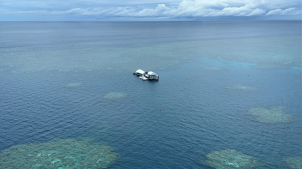 订的 Reef Magic Cruises, 三层船舱,顶上有露天甲板,坐外面风景好,海风吹着特别舒服。因为没提前报要参加的项目,与海底漫步等项目无缘。所幸直升机尚有位置,后来坐了直升机绕俯瞰了珊瑚礁,在天上短短的10分钟绕行已被这庞大的珊瑚群震撼到,想想如果有条件可以飞完全珊瑚海,估计能惊叹得掉下巴吧!飞机是加上驾驶员坐6人的很小的直升机。同乘的前面搭船上机时言语很少的女士,从下飞机坐上返平台的小船,便一直在兴奋的赞美中,与前面的沉稳判若两人。