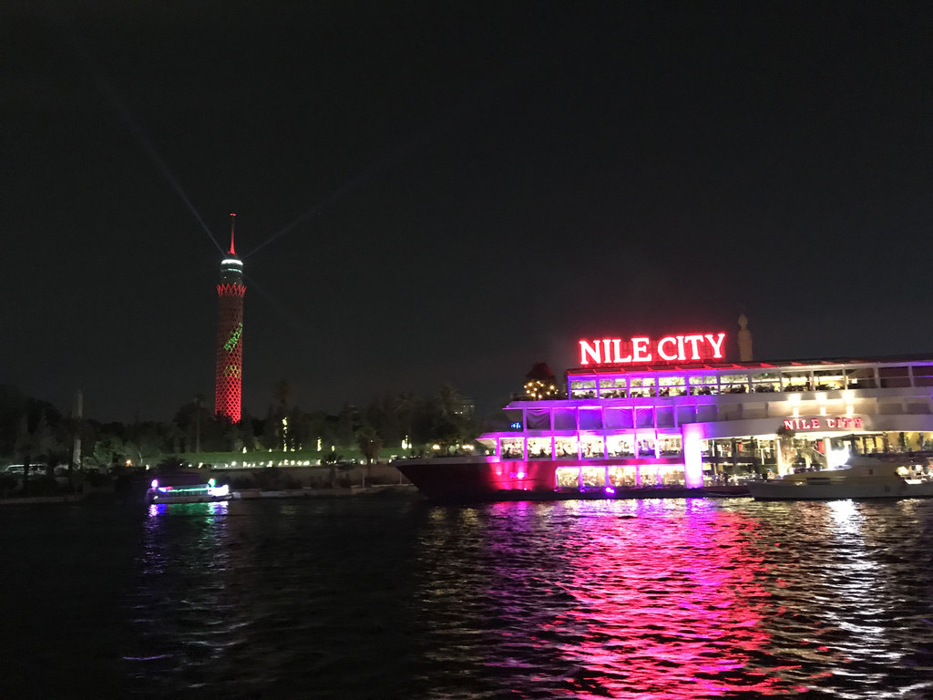 舞妹舞蹈正酣间,我出舱到船舷欣赏尼罗河两岸的风景,夏夜的尼罗河两岸虽没有灯火辉煌,但也时见流光溢彩,远处的开罗塔所呈现的红绿灯光秀倒成了一道独特的风景线。大约埃及时间十点半,我们结束了夜游尼罗河回到酒店,接下来的一天是我们此行在埃及的最后一天,我们将前往埃及历史名城亚历山大>>>>>