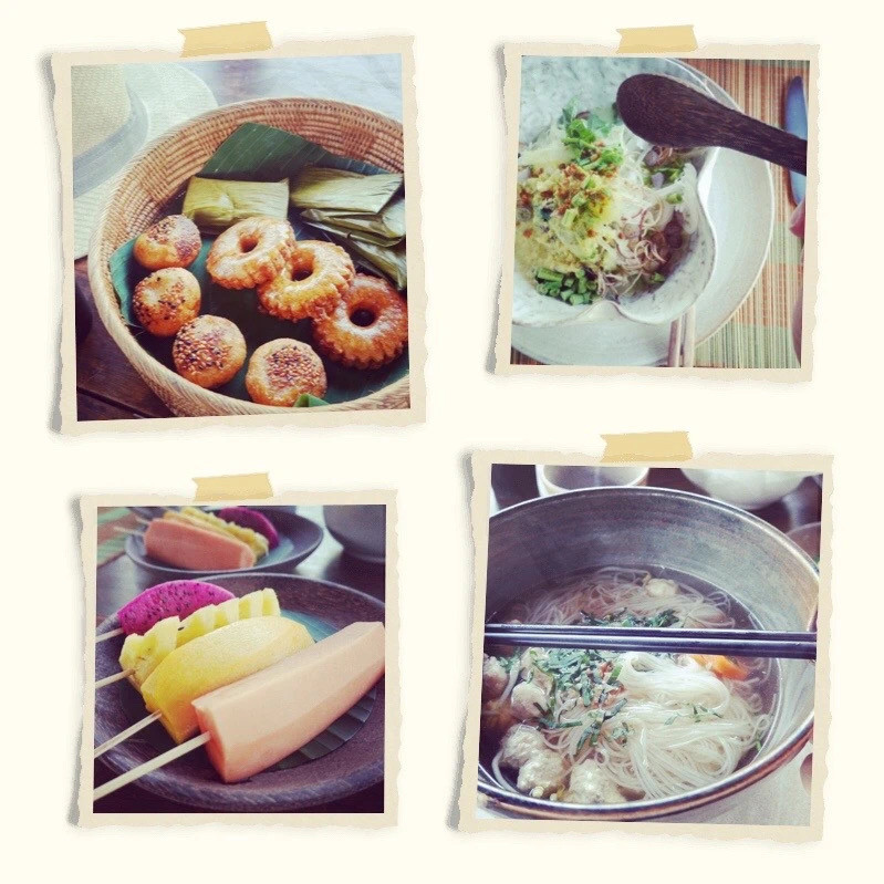 早餐上桌了,有烤的热的面包,糯米做的丸子,荷叶包的香蕉饼。