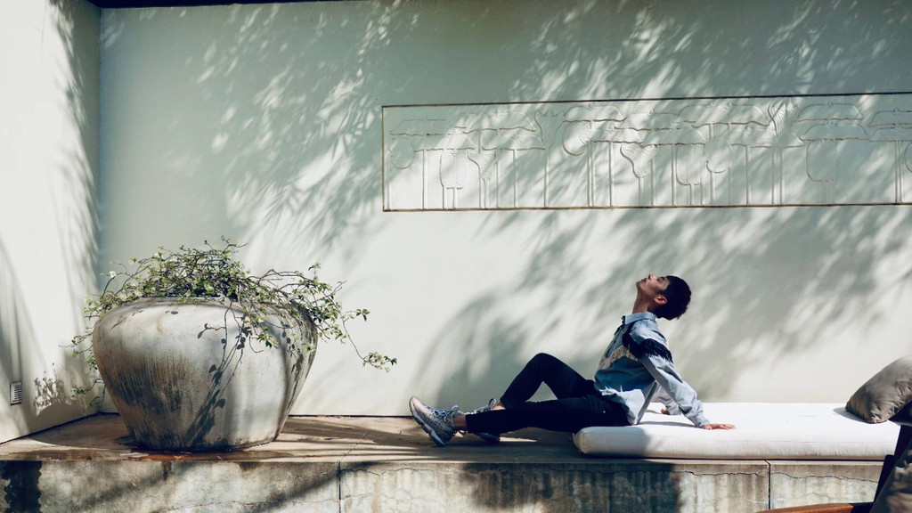 正午的阳光直射在室外的院中,树荫婆娑地跟着轻微的风摇曳着,扶手椅一旁的一汪池水中,鲤鱼正活泼地畅游。