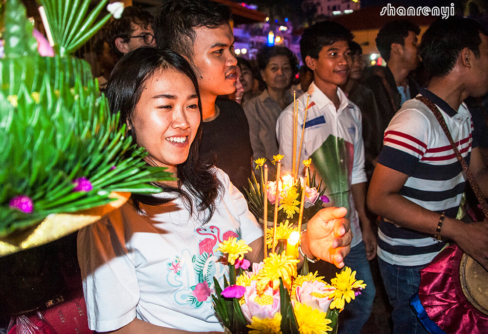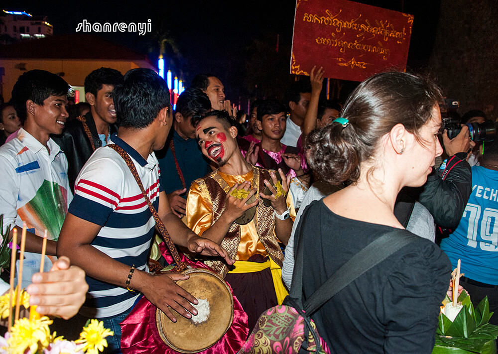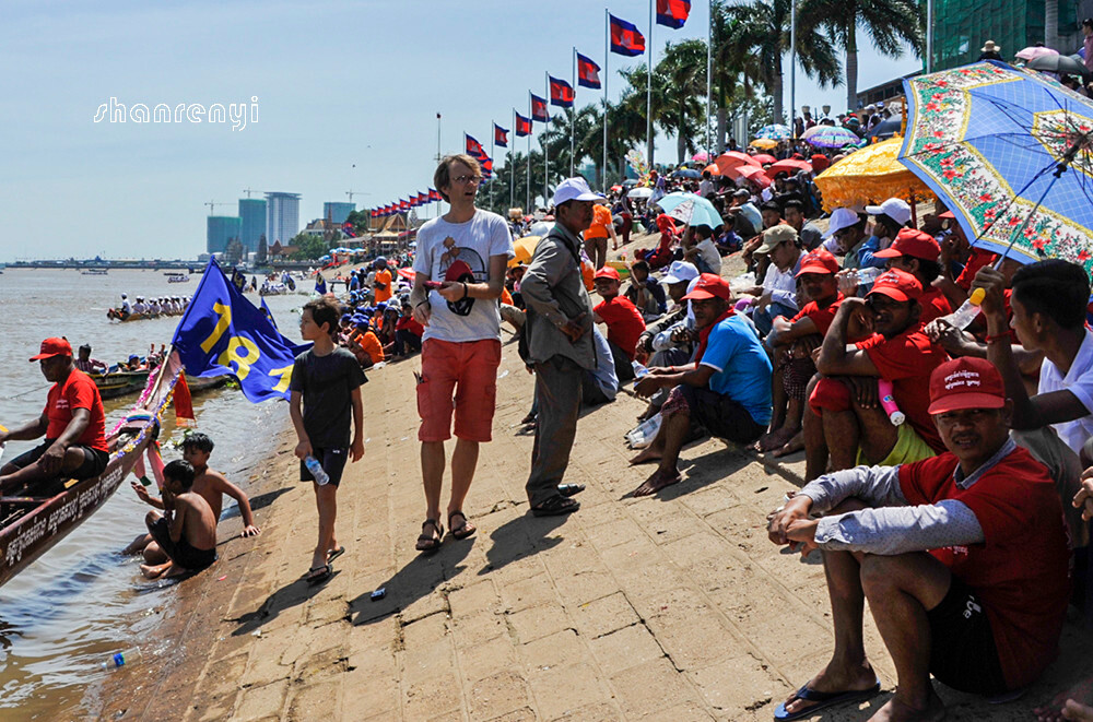 送水节时的湄公河边。穿红色衣服的是准备参加龙舟比赛的队员