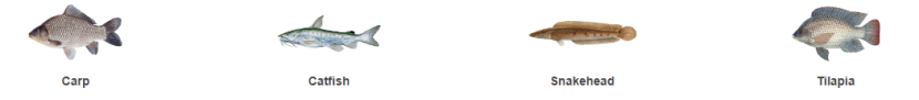 Carp 鲤鱼、Catfish 鲶鱼、Snakehead 乌鱼、Tilapia 罗非鱼