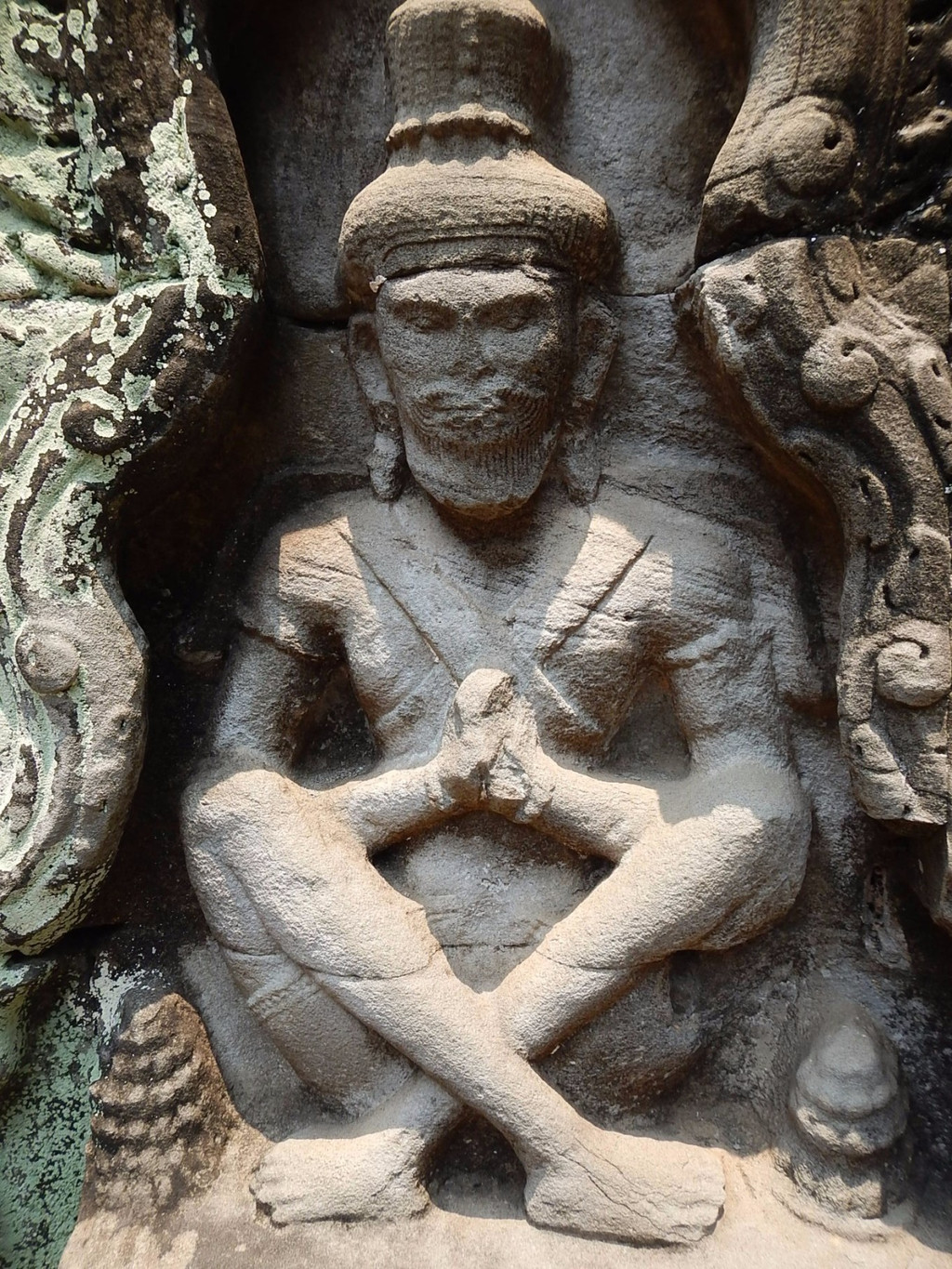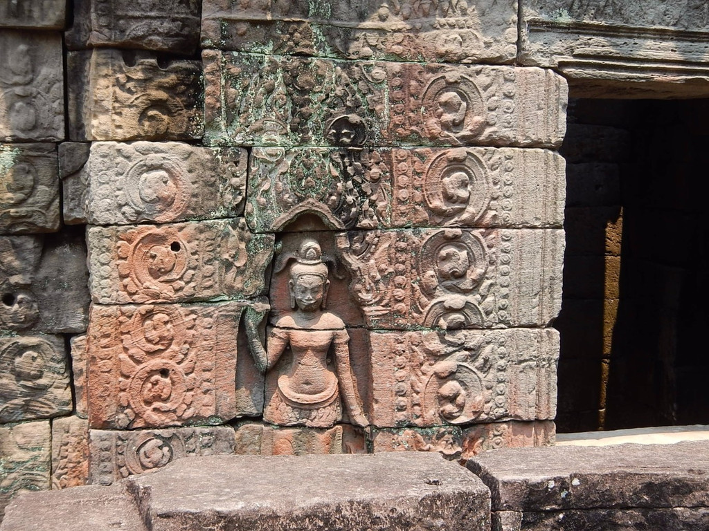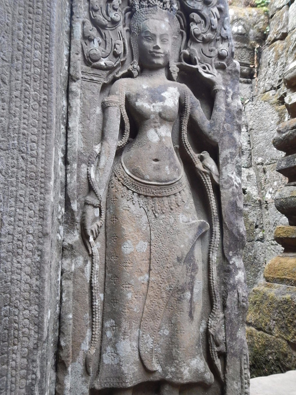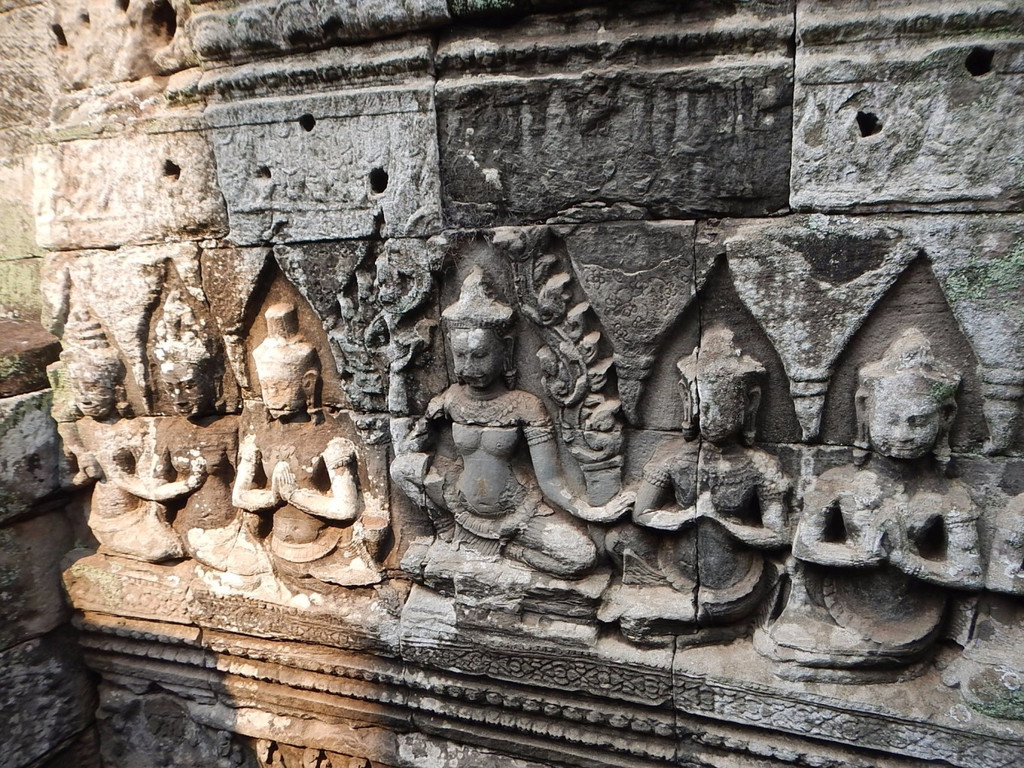 这些石刻都是原版的,非常精美!可以说吴哥每块石头上都有雕刻。处处都显示出工匠们的高超技艺,以及那个时代一代王朝的鼎盛风貌。石刻中很多女性都是这个动作,手作莲花置于肚脐。象征生育,暗示吴哥王朝生生不息。希望是美好的,现实确是骨感的。