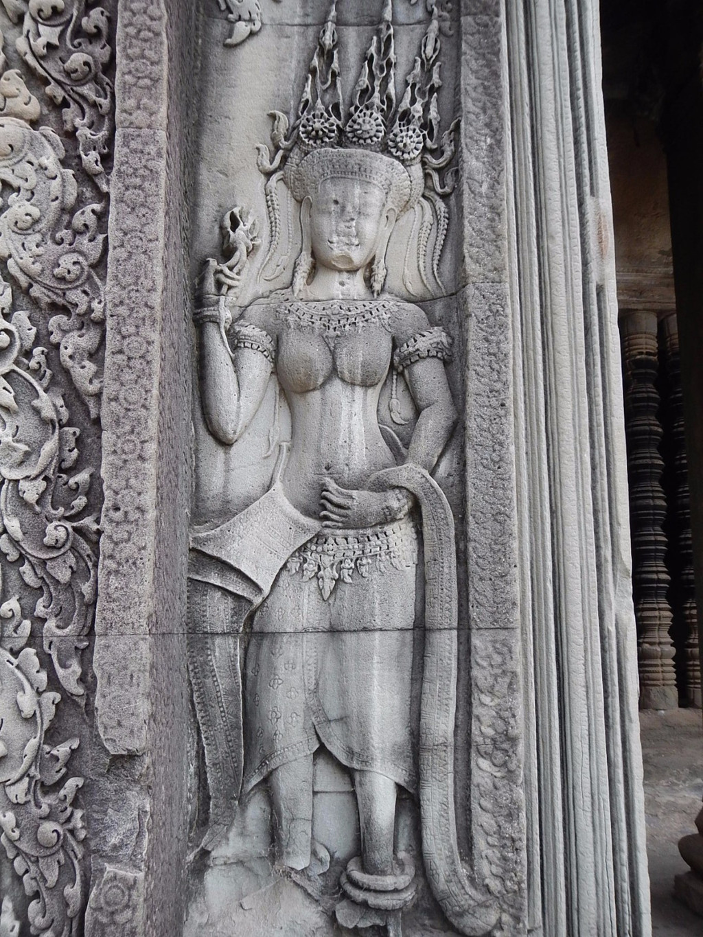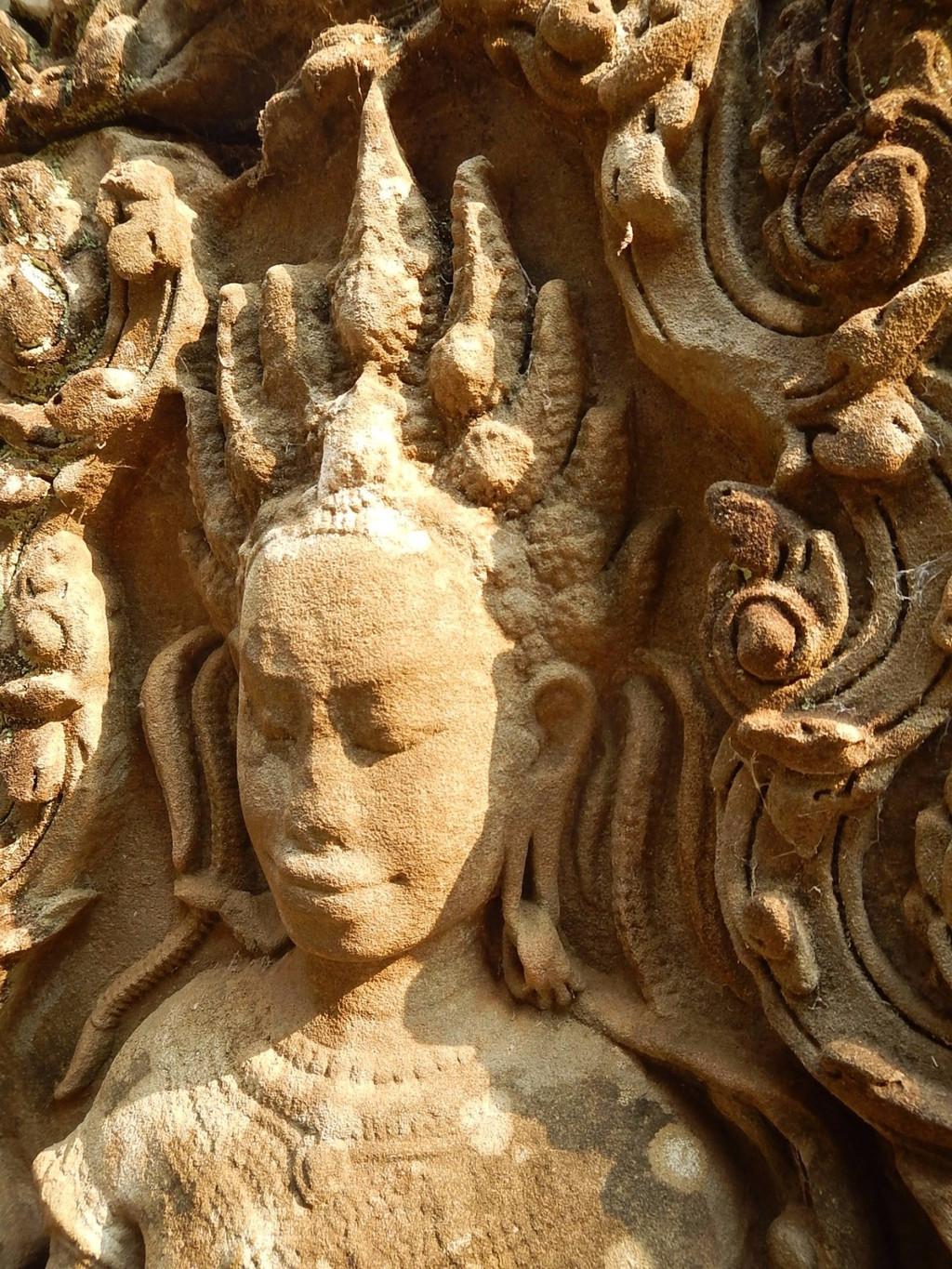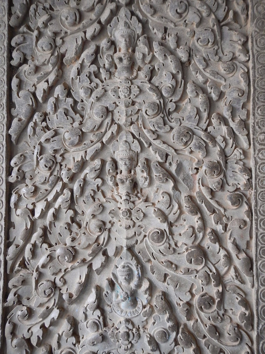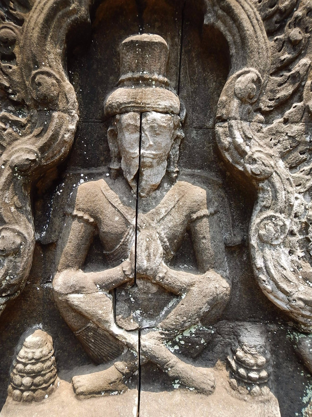 这些石刻都是原版的,非常精美!可以说吴哥每块石头上都有雕刻。处处都显示出工匠们的高超技艺,以及那个时代一代王朝的鼎盛风貌。石刻中很多女性都是这个动作,手作莲花置于肚脐。象征生育,暗示吴哥王朝生生不息。希望是美好的,现实确是骨感的。