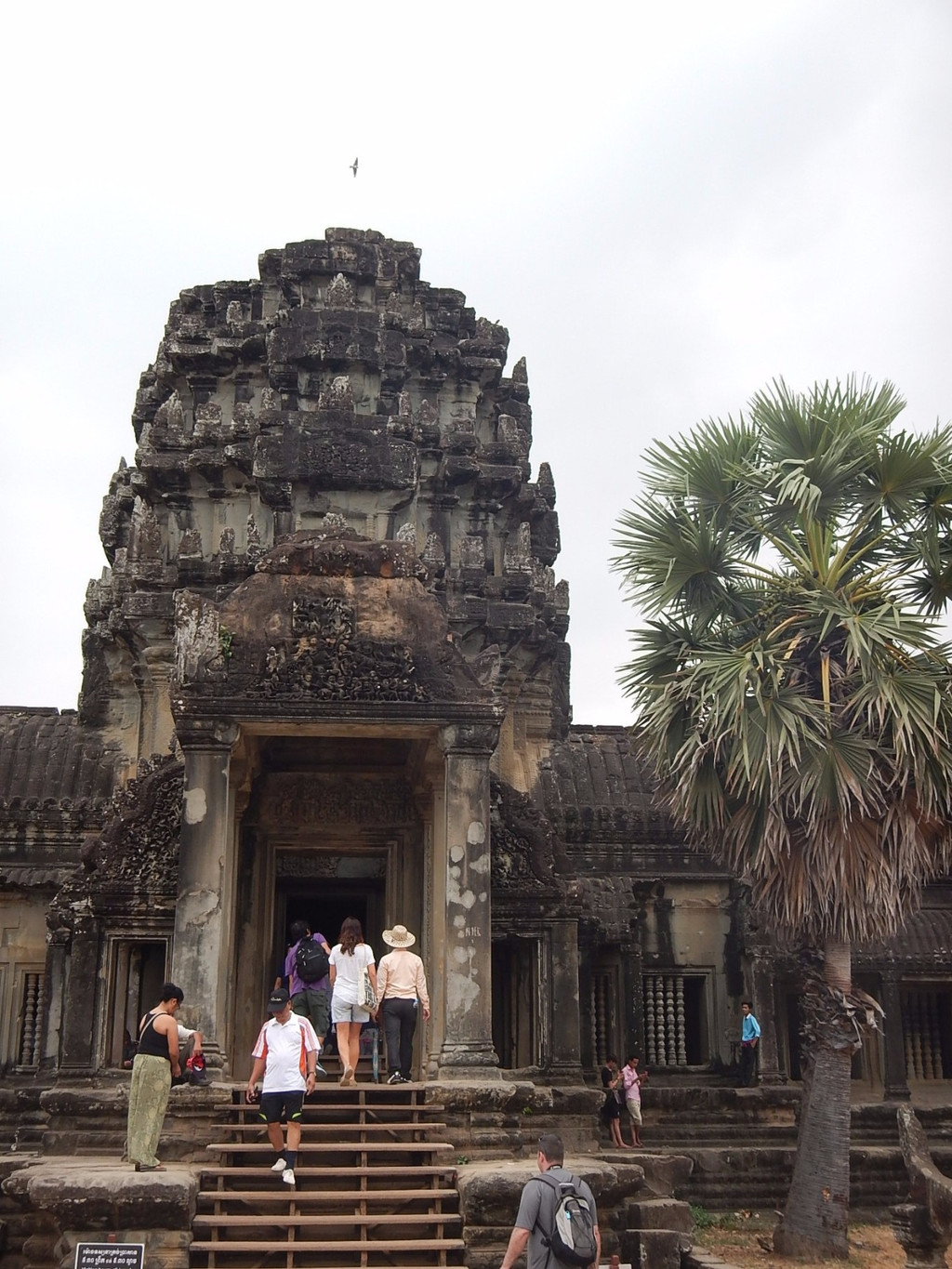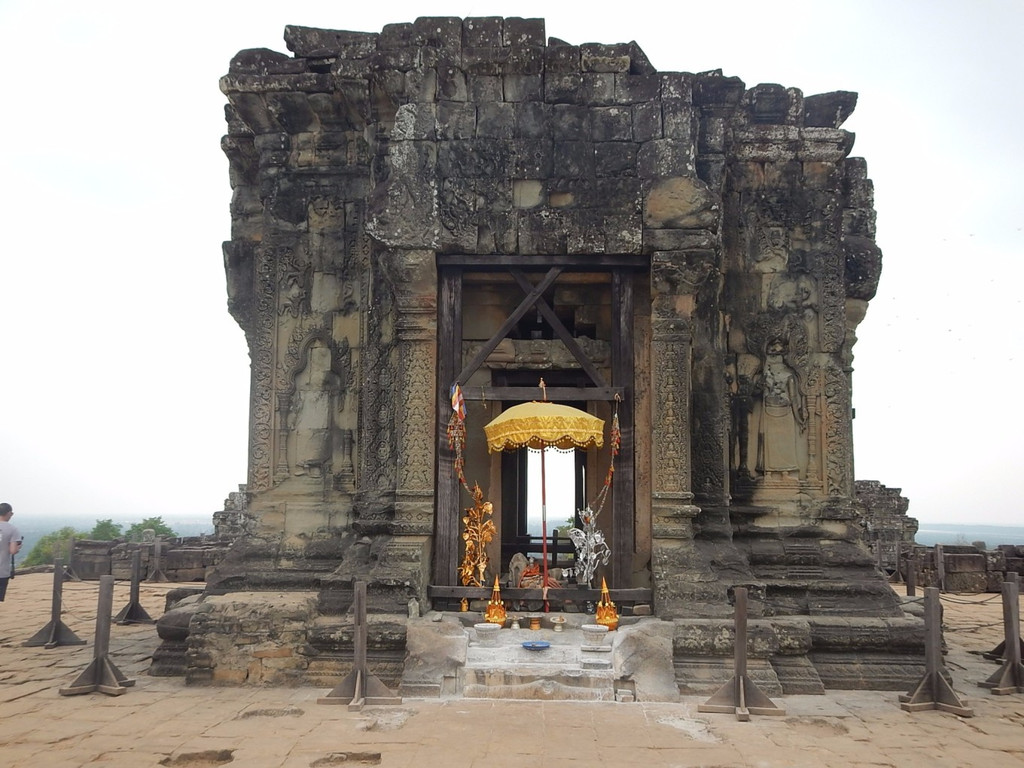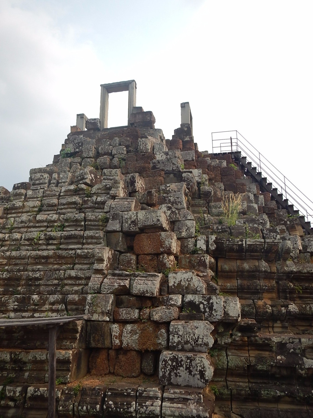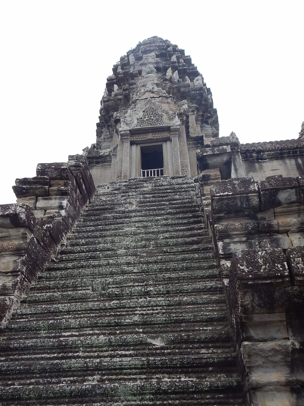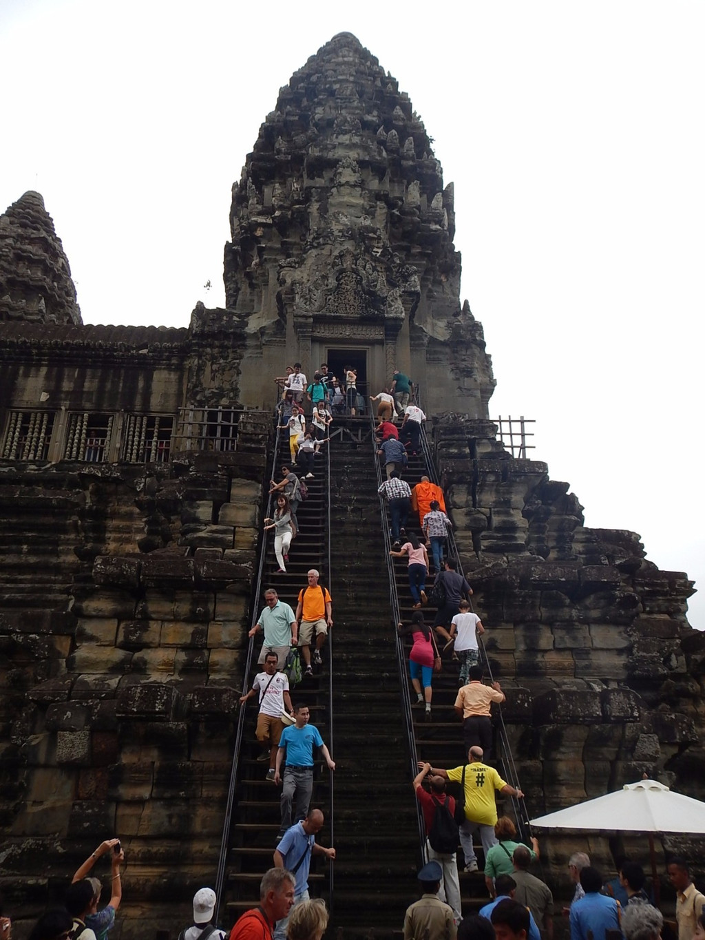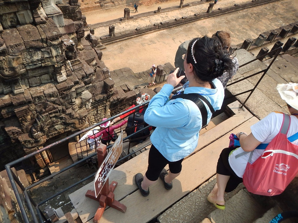 小吴哥中心部位有一高塔,可以登顶,非常陡峭,另外登顶的话对着装是有要求的,在吴哥其他部分,如果吊带热裤都没问题,如果上这个塔必须不能穿的太少,短裤如果太短是不能上去的。
