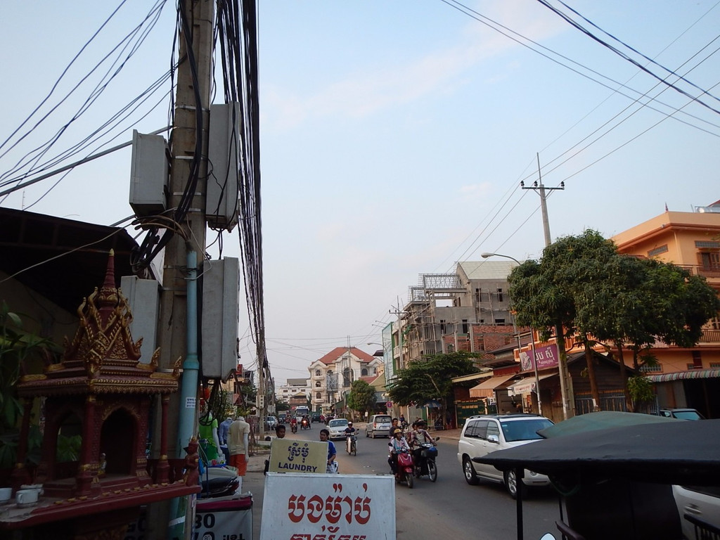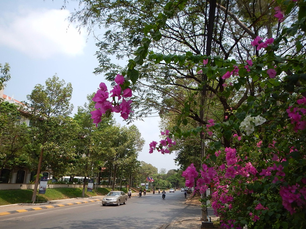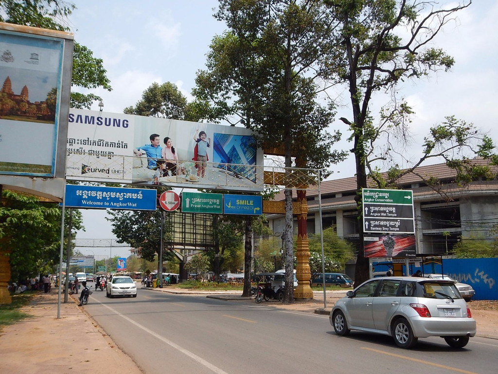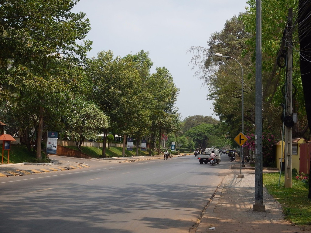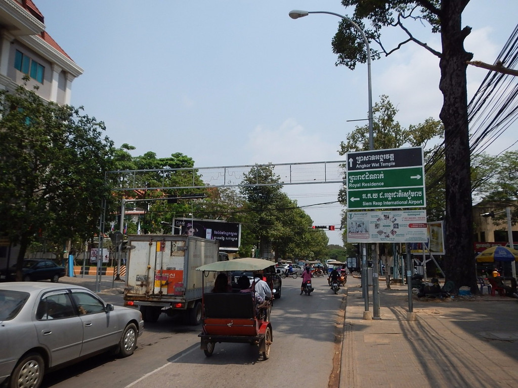 本来想着逛逛就回酒店了,结果一看时间尚早,还不到中午呢,突发奇想,何不现在去买票?哎。妈妈咪呀。攻略不做好就这么悲催。要知道怎么悲催?请往后看。顺着下边照片的路一直往北走就能到售票处了。别问我怎么知道的,路牌上写的去往吴哥,售票处一定在路上啊。好吧,这点我是猜对了,但是忽略了距离。