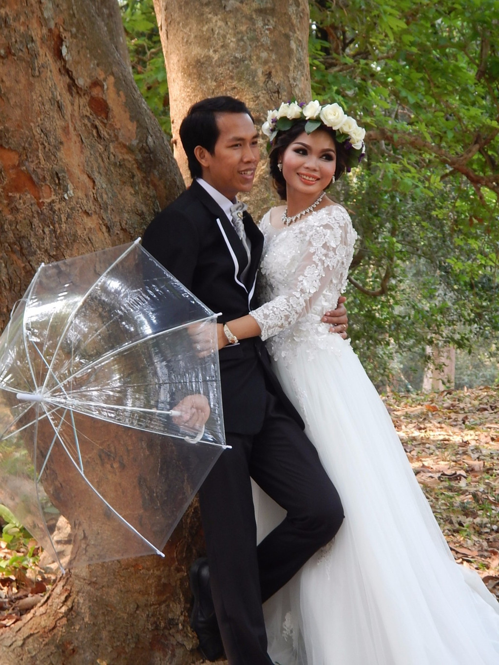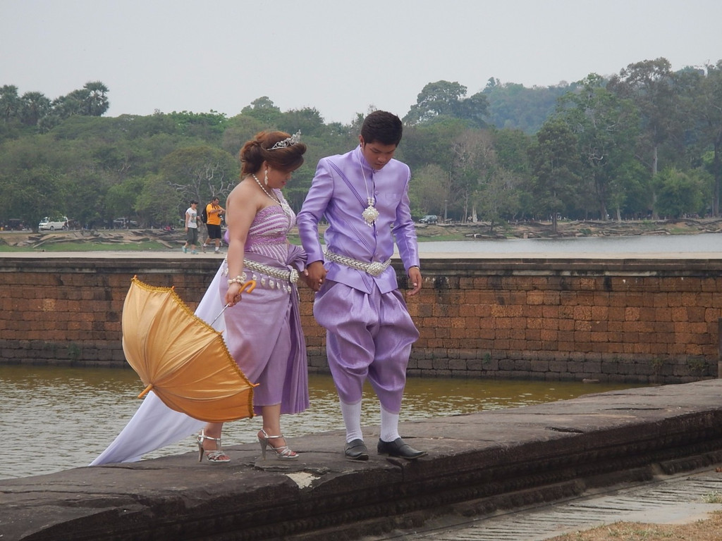 在小吴哥的东门外,有拍婚纱照的一对情侣。我来蹭拍一下。