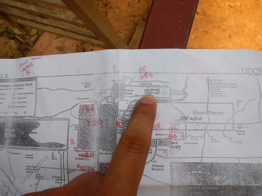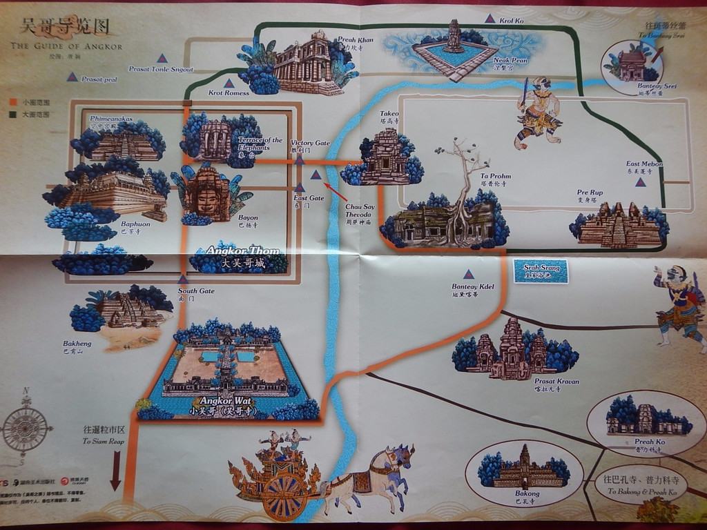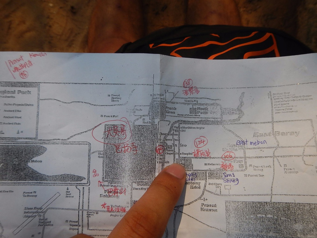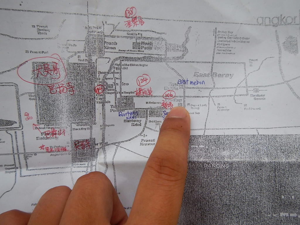 科普一下吧,四叶草其实是三叶草的变异品种,要在三叶草里边找,且叶子是心形的。因为是3叶草变异品种,所以特别难找,找到了就是幸运草。大家看下图的下方没有在地图上是酒店区域,我的手指把小吴哥挡住了,上方是巴杨寺也就是吴哥微笑,好 多佛 脸那个地方,还有象台啊 女王宫什么的,一路像北是涅槃宫刚才介绍过,往地图右侧(东)到变身塔,这叫大圈!