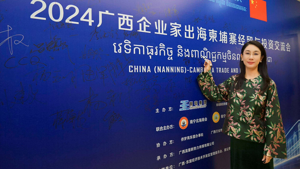 朱靖涵登台致辞,她开篇点明当下2024企业家出海柬埔寨经贸与投资交流活动的关键意义,强调在这一大潮中,柬中两国紧密携手机遇无限。