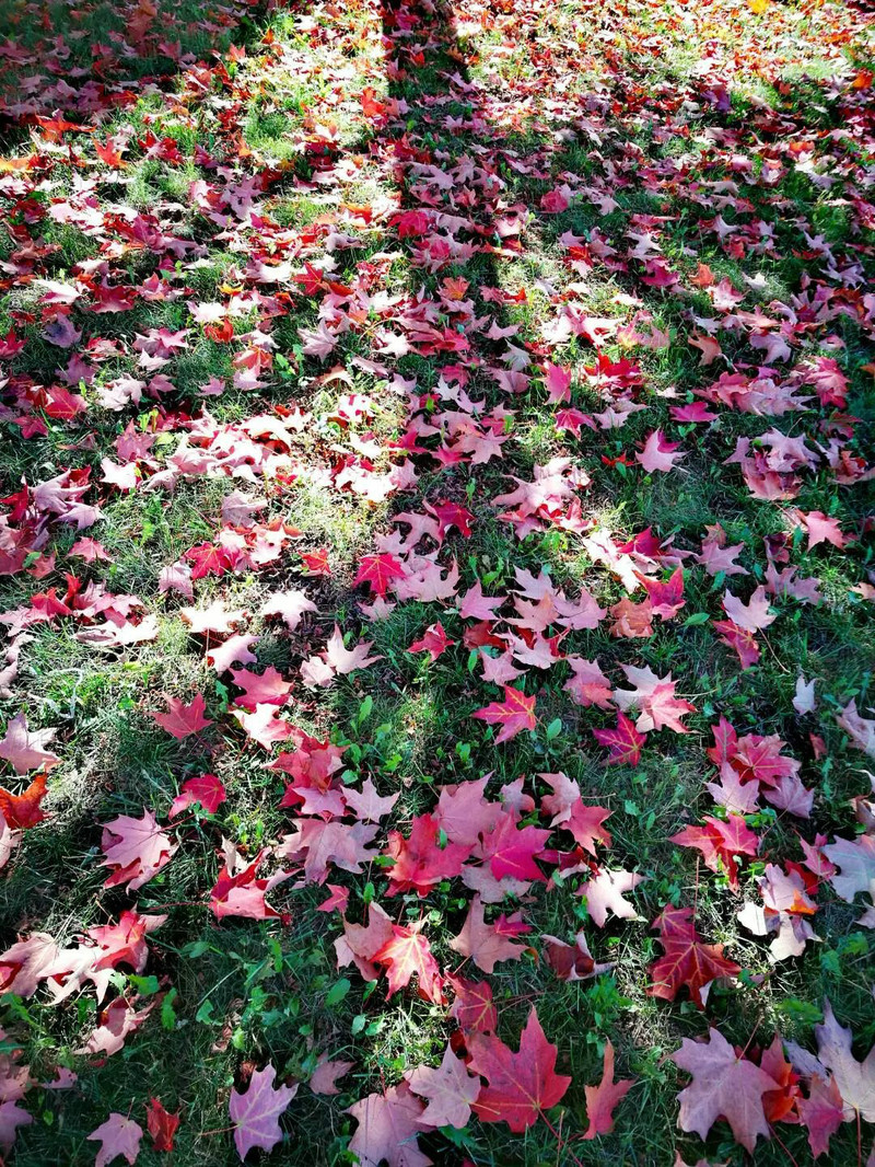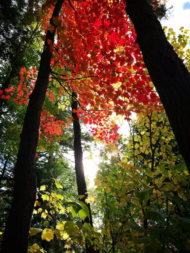 好喜欢眼前的画面,斑驳的阳光从树的罅隙中照射出来,多彩的叶子也都泛出耀眼的光芒,让色彩变得愈加浓烈。多么美好的生活啊。