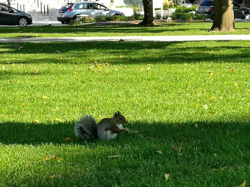 街道上的松鼠,一点也不怕人,在青青草地上到处寻觅着它的美食。