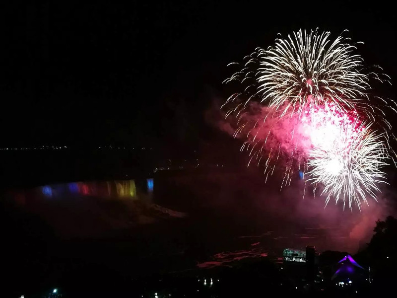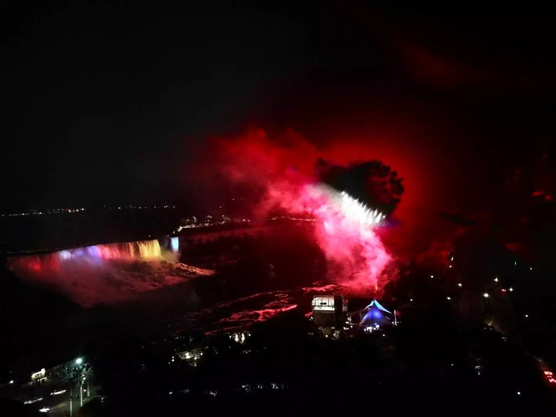 瀑布上的色彩已经足够斑斓梦幻,而这璀璨炫目的烟火更添瀑布在夜色下的迷离之色。
