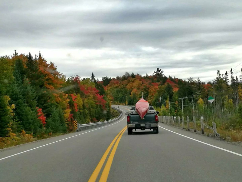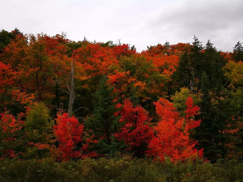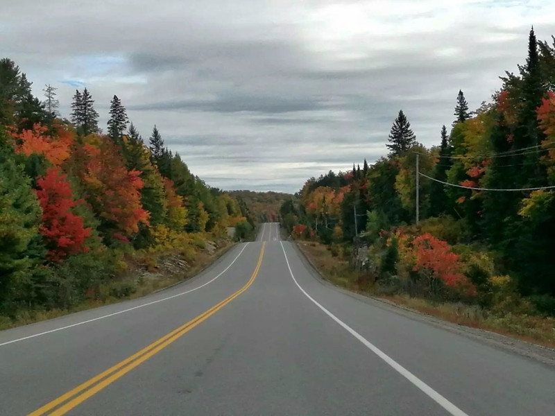 去往阿岗昆公园的路上及阿岗昆公园内到处是这样被五彩斑斓的枫叶包围的公路,一眼望不到边,很美。