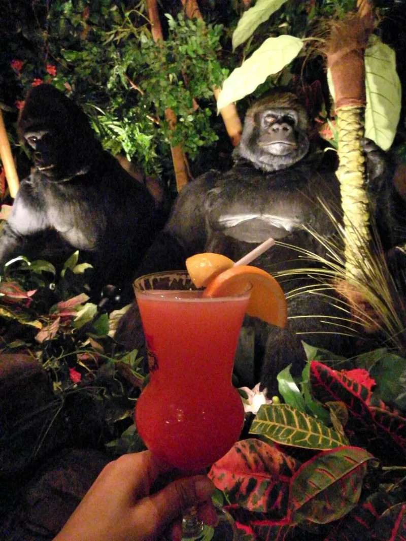 小镇里吃饭,小妞选的地方实在有情趣,基本是热带雨林的风格,豹子、大象、猩猩等等都栩栩如生。偶尔都会发出逼真的叫声、吼声,昏暗的灯光下,一不下心真的以为自己进入了热带雨林。