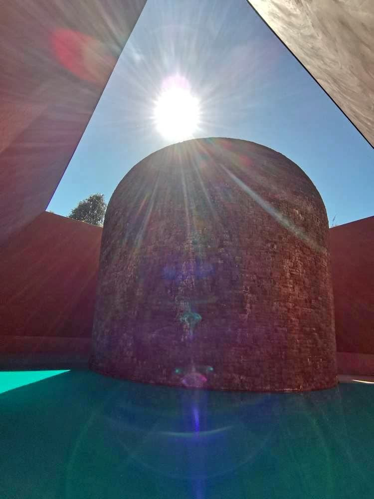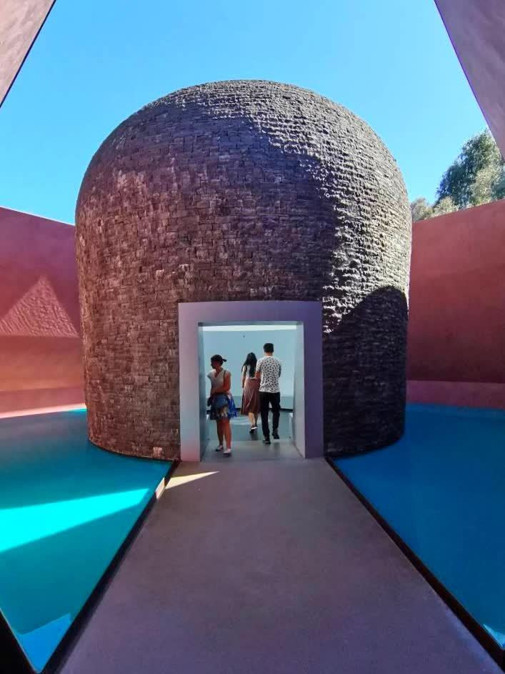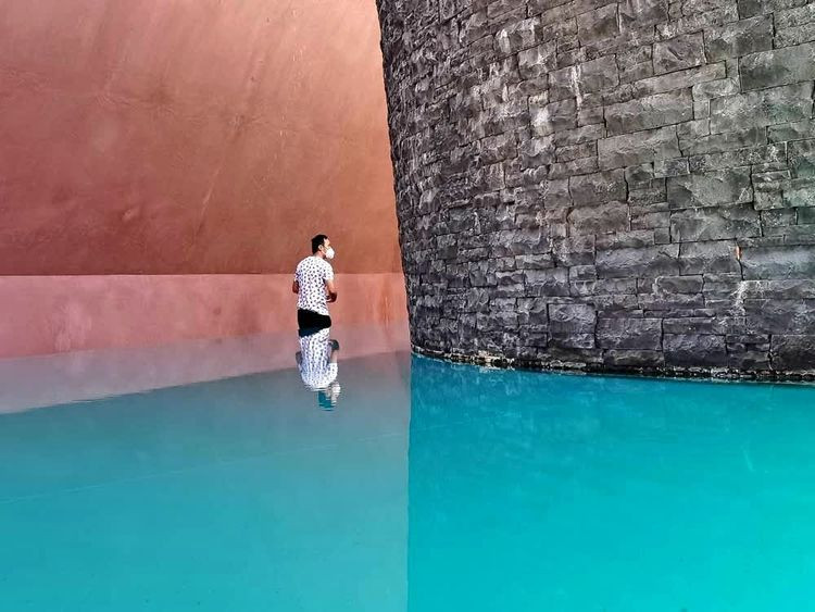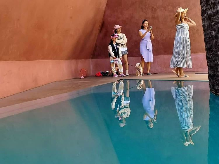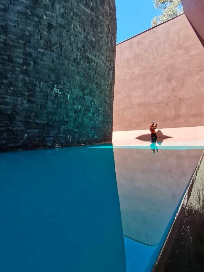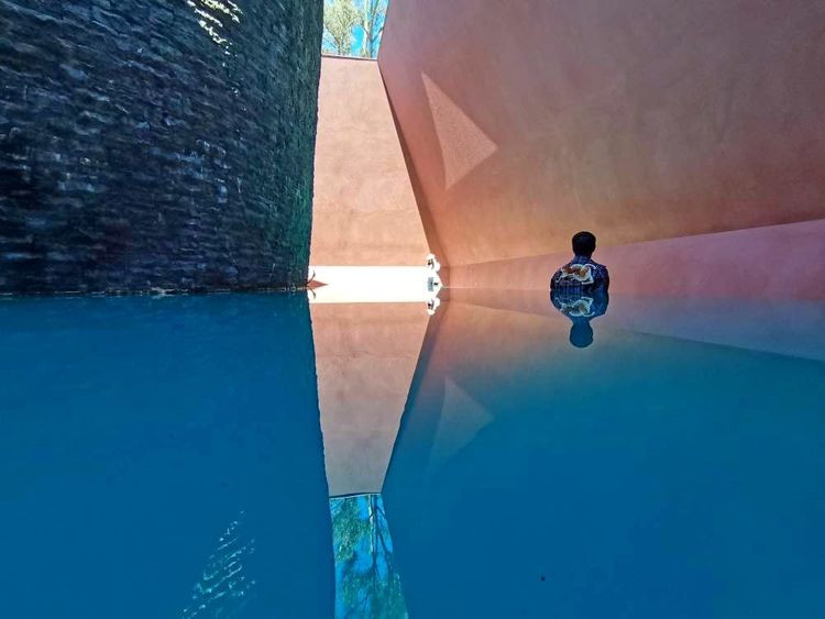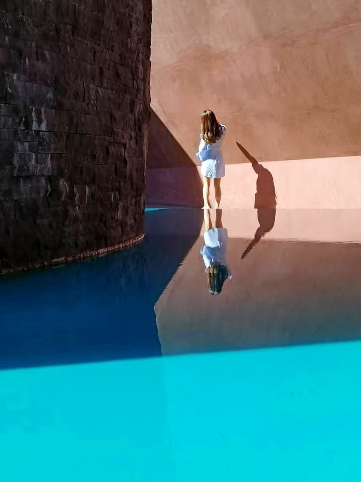 蓝蓝的水池配上粉色的墙壁,光影交错在空间的每个角落,是个充满惊喜的地方。随着天气变换光影,极具温柔的艺术感。