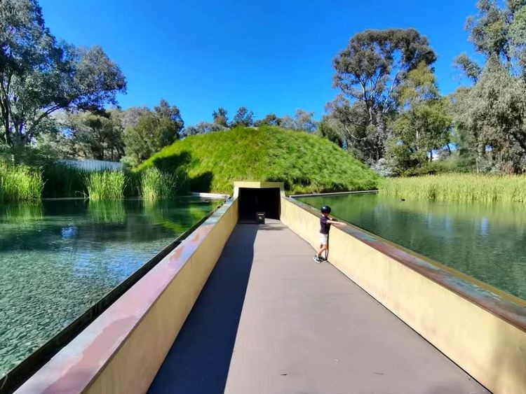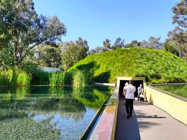 堪培拉网红打卡景点“天空之城”,就在国立美术馆旁边的一个小山丘,其外部是能倒映天空和草坪的一片湖面镜,诗情画意,这是美国艺术家 James Turrell 的作品。