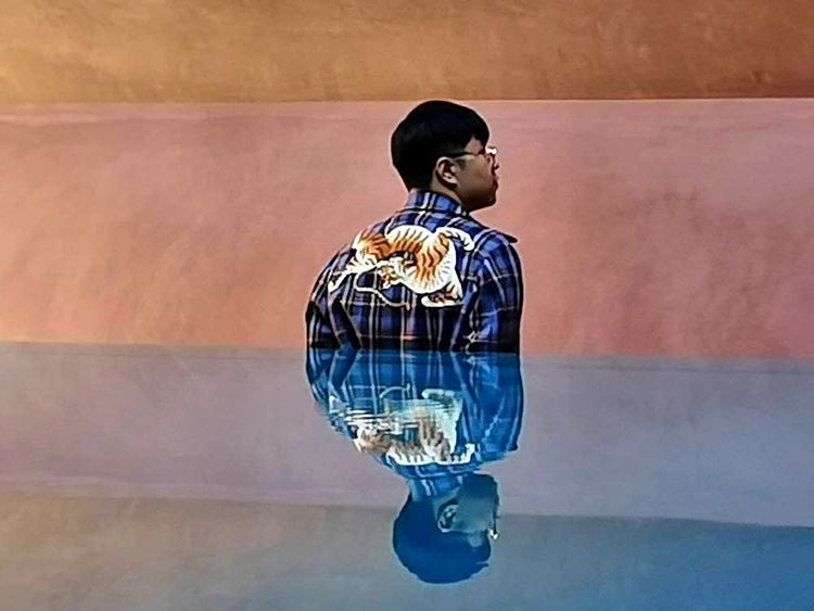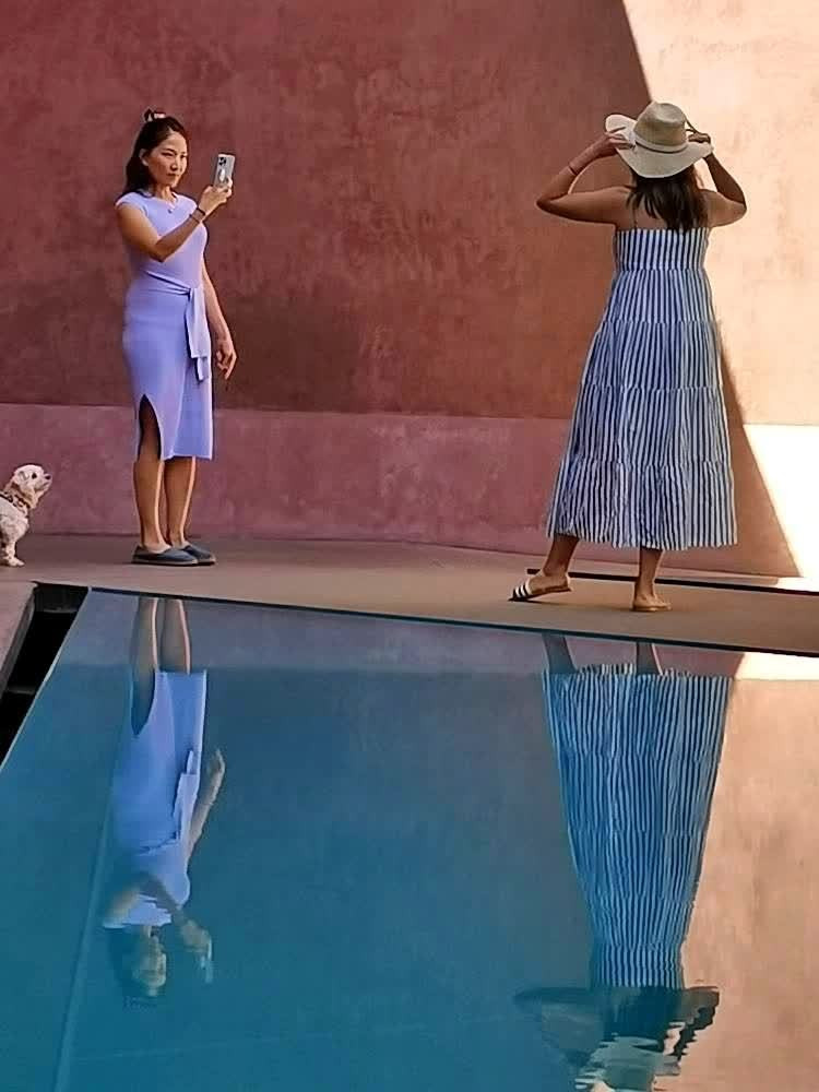 人物站在水池旁,在水池另一边的下方拍照,让墙线与拍照人物保持水平一致,这个位置可以拍出很棒的照片。