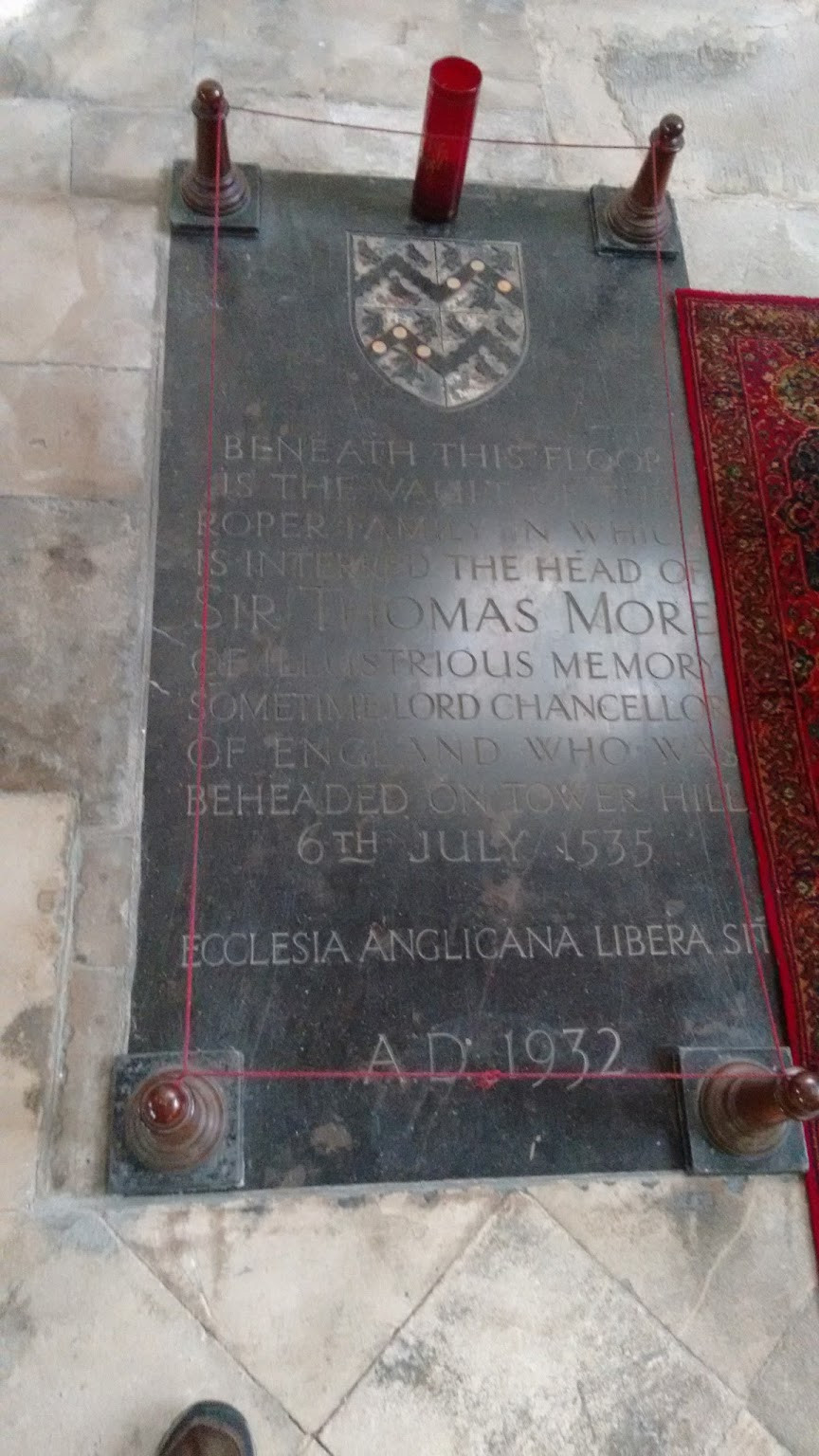 在1529年10月至1532年5月16日,英格兰大臣托马斯·莫尔爵士(Thomas More)因反对亨利八世兼任教.会首脑而被处死。亨利八世当时反对新教改革和亨利脱离天主教,他拒绝承认亨利为英格兰教会的最高元首,并拒绝废除与凯瑟琳(Catherine of Aragon)的婚姻。莫尔被判叛.国.罪并被斩首之后,他的头挂在伦敦桥上的长矛上。莫尔的女儿玛格丽特·罗珀(Margaret Roper),从伦敦桥救回了父亲的头,并将其运到坎特伯雷的圣邓斯坦教堂,也就是她家对面。莫尔被安葬在教堂的罗珀礼拜堂内的一个地下室中。