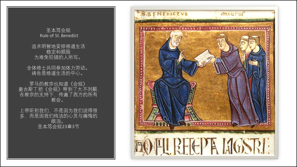 触摸简单的丰富:上文提过的奥古斯丁是圣本笃修士。在修道院里讲述圣本笃的故事真是再合适不过啦。努西亚的圣本笃St. Benedict of Nurisia是西方修道主义的创始人。3月21日为圣本笃纪念日。本笃大约在公元480年出生于意大利的小镇努西亚(Nursia)。他的家族是罗马帝国的老牌贵族。大约在二十岁时决心成为隐修士,因此立家生活在洞穴之中。后来,他过了一段极端禁欲的生活。最后,他的名气越来越大,一群门徒聚集在他的身边。当他的洞穴已经不再能实现他修道的愿望时,他把这个小小的修道群体搬到了卡西诺山(Monte Cassino)。卡西诺山很偏僻,他在那里的树林里建了一座修道院。随后不久,他的妹妹在附近也建起了一座女修道院。最终,本笃的名气大到连当时的国王——东哥特国王也来拜访他。但是,等待这位国王的只是这位修士的严厉批评和可怕的预言,因为在本笃看来,他是一个暴君。