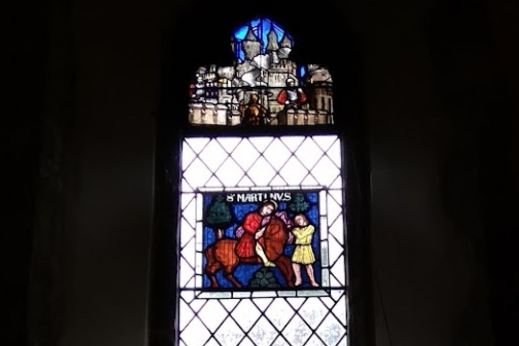 上图的这扇窗是由来自沙特尔大教堂的中世纪的玻璃制成的,嵌入图像显示马丁是一个年轻的罗马士兵,将斗篷割成两半与一个穷人分享。