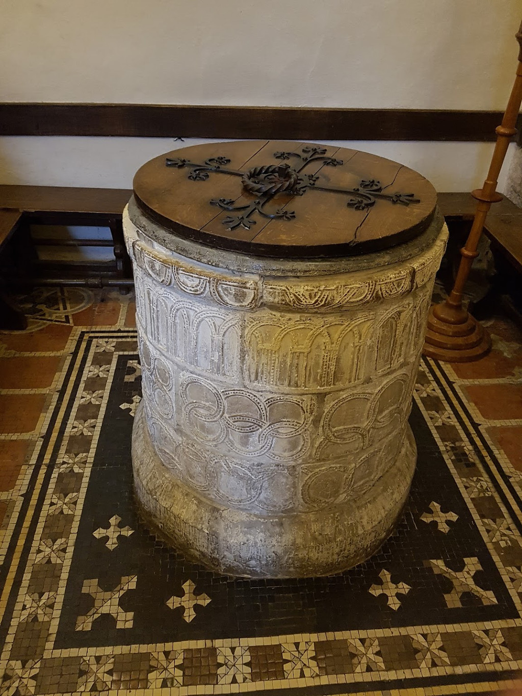洗礼盘,用于洗礼。埃塞尔伯特国王(King Ethelbert)可能于597年在圣马丁教堂接受洗礼。这个古老的盘是由大教堂回廊的一个于1155年和1165年之间建成的井口构造而来。