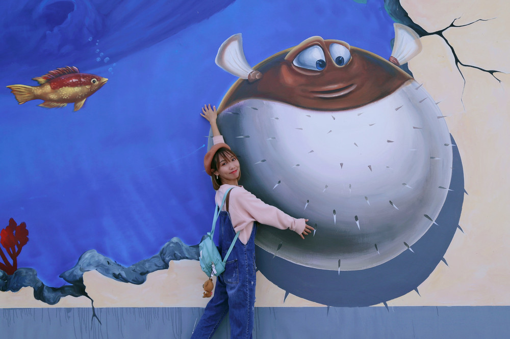 每座房屋和小院的墙壁上都绘着大大的涂鸦,碧蓝大海上是气鼓鼓的河豚,小鱼虾展现着小镇的风土人情,每幅画面都栩栩如生,让整个小镇生动了几分。