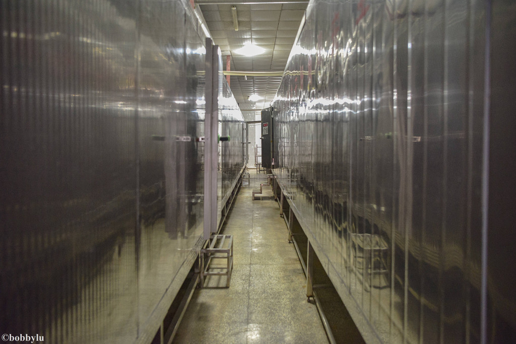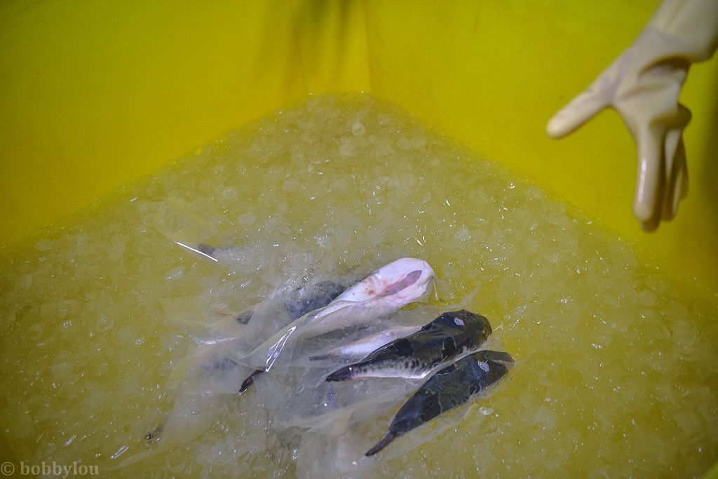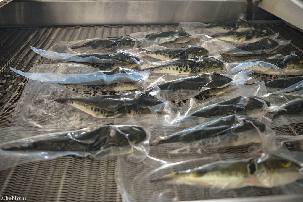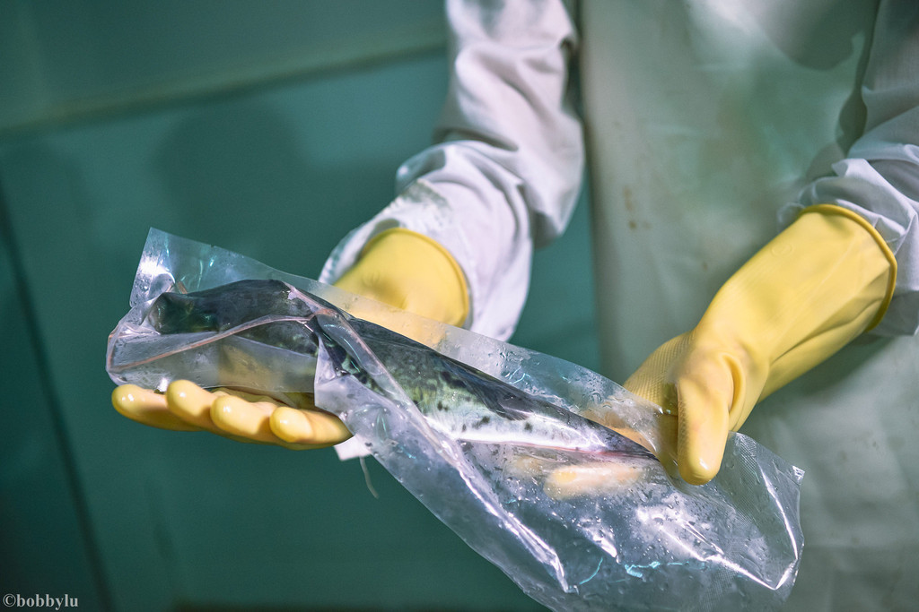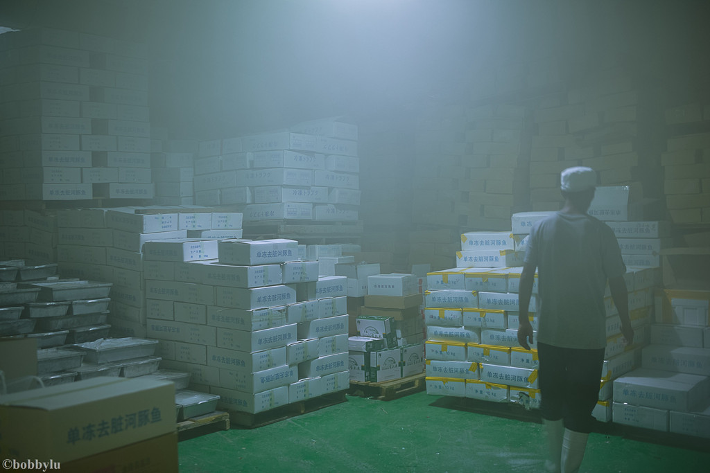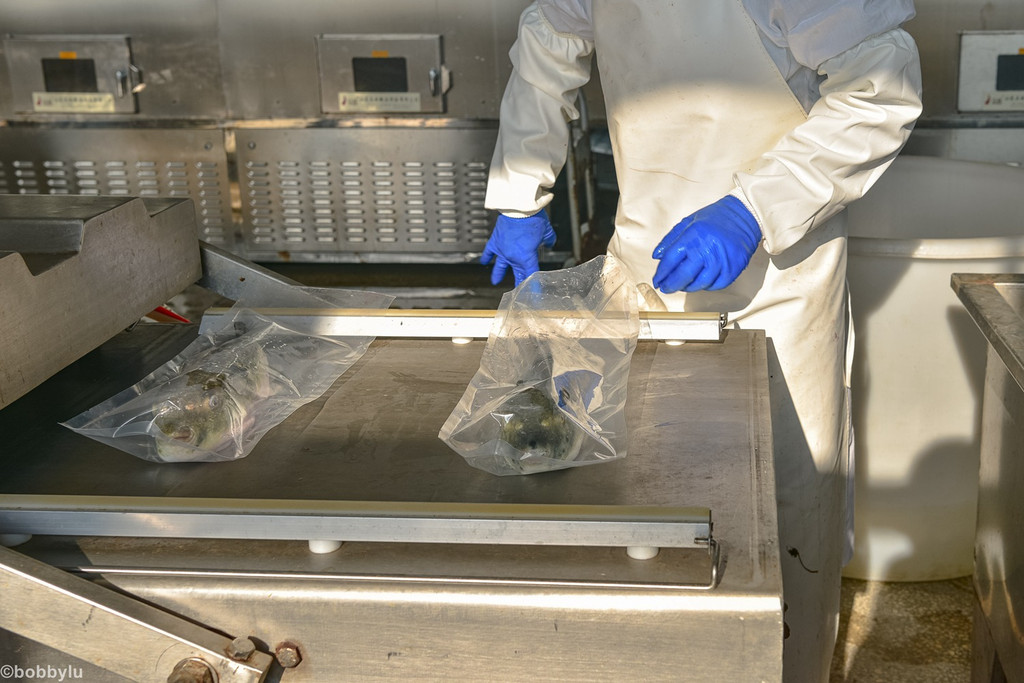 在不经意间,四十多分钟的时间很快就过去了,红鳍东方豚被冻成硬邦邦的,甚至可以相互敲击出响亮的声音且不会变形,据说,这也是检验红鳍东方豚是否被冷冻达标的一种检测方式!如果达标,河豚鱼会被装箱送至冷库保存。而冷库的温度,也接近零下三十八度之低,只有这样的温度,才能在河豚上到餐桌前,始终保持刚从养殖场打捞处后被处理过后的新鲜程度!可见工序虽显繁琐、但却快速有效地实现了河豚鱼保鲜的这一终极目标!