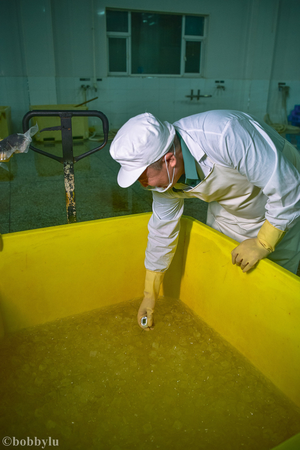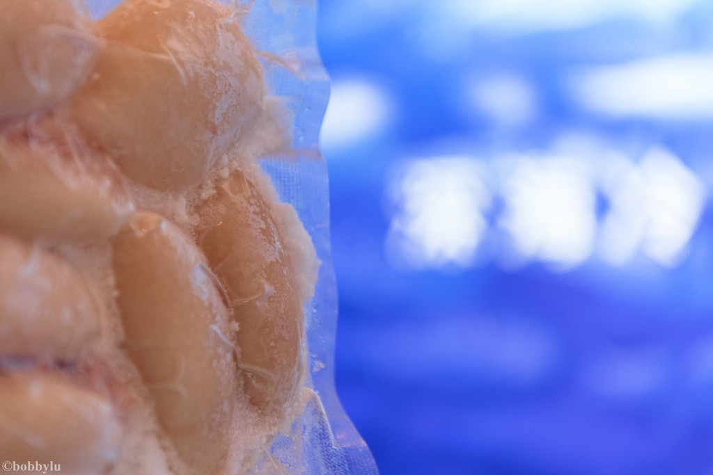言归正传,当河豚经过严格的程序处理干净内脏之后,迅速将河豚塑封,并投入到装满冰水混合的大桶中,以零度温度锁住河豚的鲜度,据说这个温度是最接近河豚新鲜程度的温度。然后迅速再装箱送到极冻车间进行速冻。