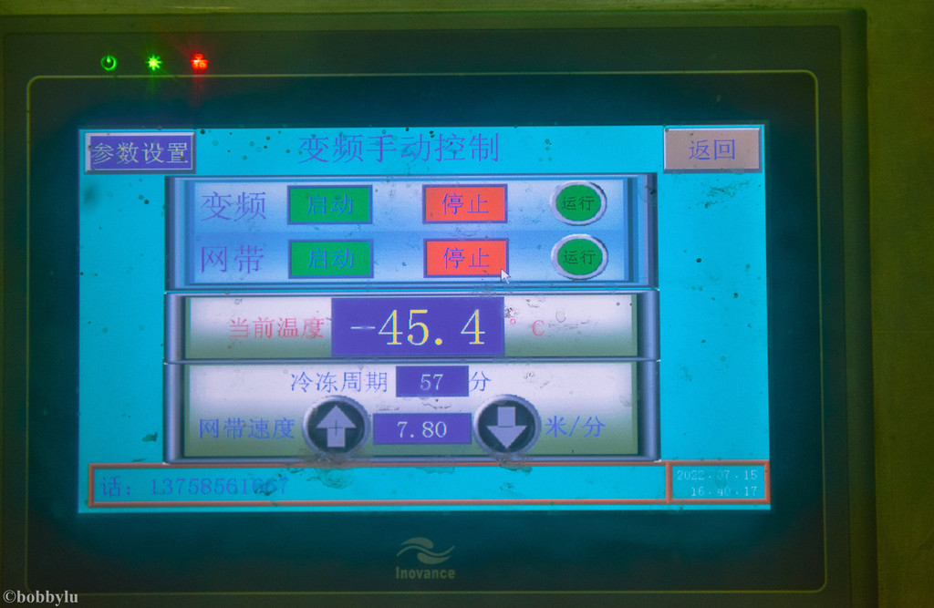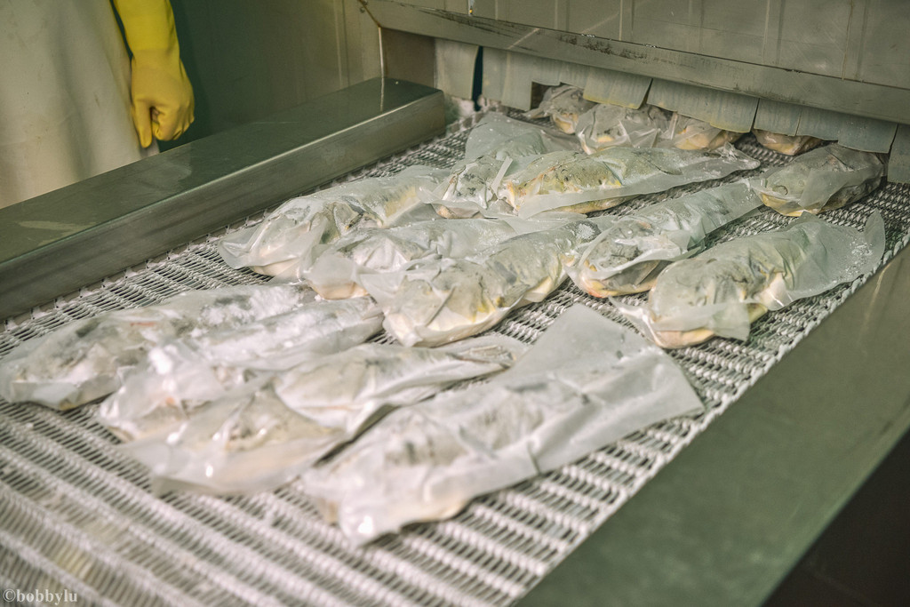 在速冻车间,偌大的机器轰鸣声不绝于耳,传送带上码放着即将进入循环制冷的抽真空红鳍东方豚。这台机器足有接近两层楼的高度,可以在短短的一小时之内将数千件需要速冻的产品在零下45度的温度下迅速冷冻。据说,这台机器运转一小时的费用超千元,真是下足了本儿来保证河豚鱼的品质啊!