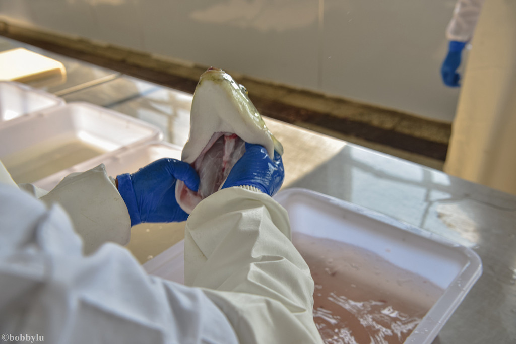 鲜活的东方红鳍豚从捕捞出水到送至加工单位车间,再到冷链保存单位、这一系列工序,是相当缜密且不简单的。而这一切工序,都是为了保证可以安心地让食客品尝到美味且绝对新鲜的东方红鳍豚!