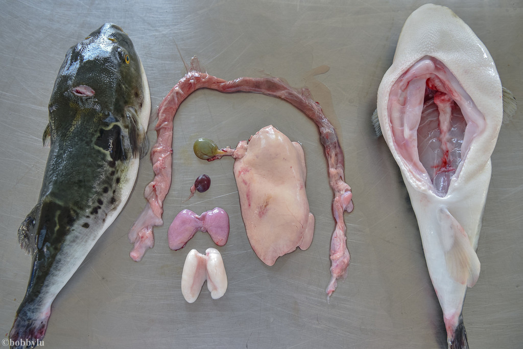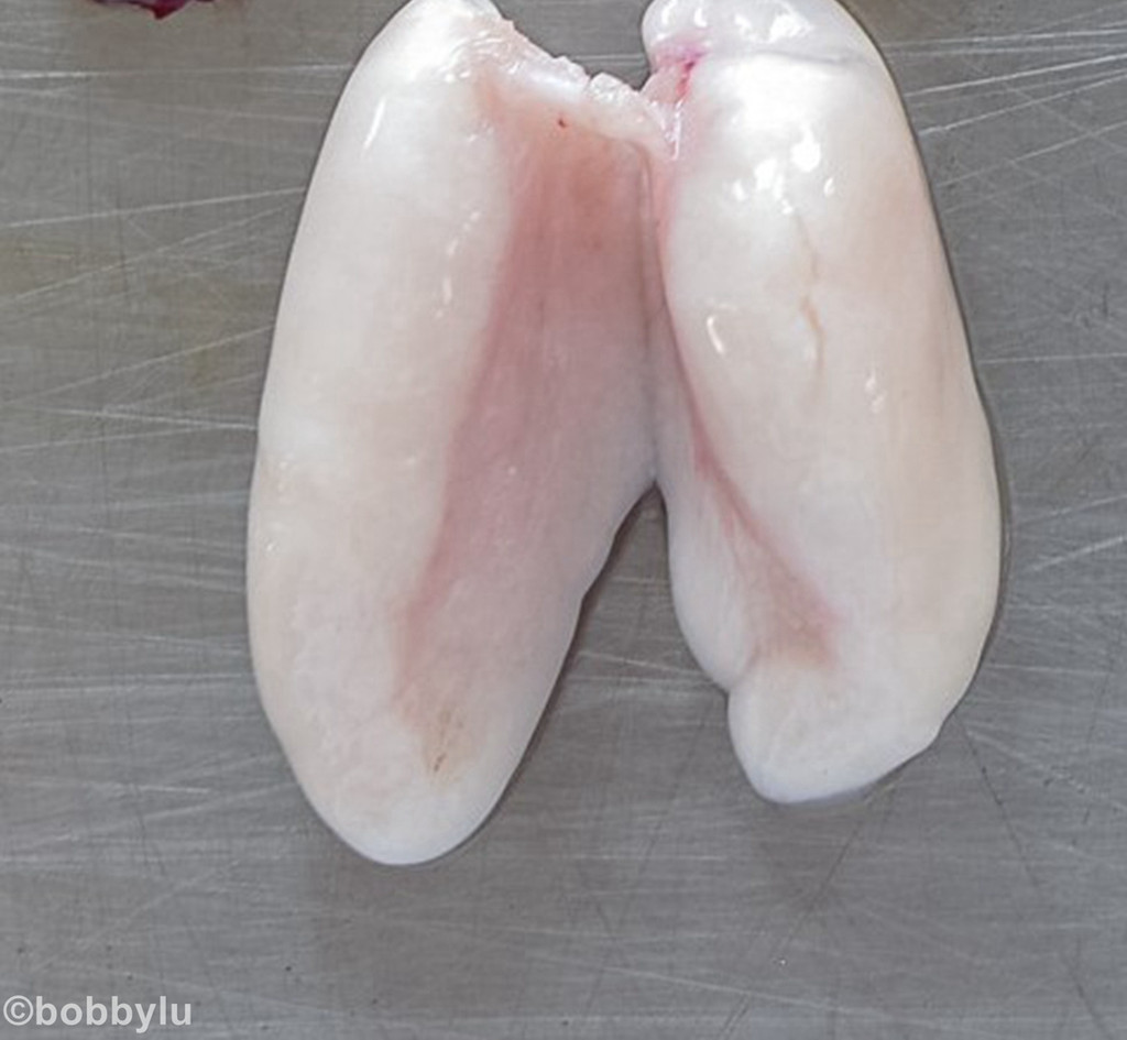 经过车间加工人员以快速专业的手法对河豚进行处理过后,河豚就已经达到可以安心食用的级别了。但为了最大程度地保鲜,后续还将有更多的繁杂工序。但就是目前河豚的状态,我们可以直观地看到河豚身上舍弃以及最鲜的某些部位,除河豚肝脏是最为鲜美的部位之外,还有一处,也是自古就被喜食河豚的人们赞誉为“白子”或"西施乳”也就是河豚鱼的精囊!在传到以食生鲜鱼类最为出名的岛国日本,在那里、人们称其为“海钻石。